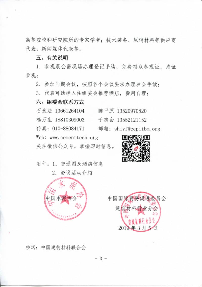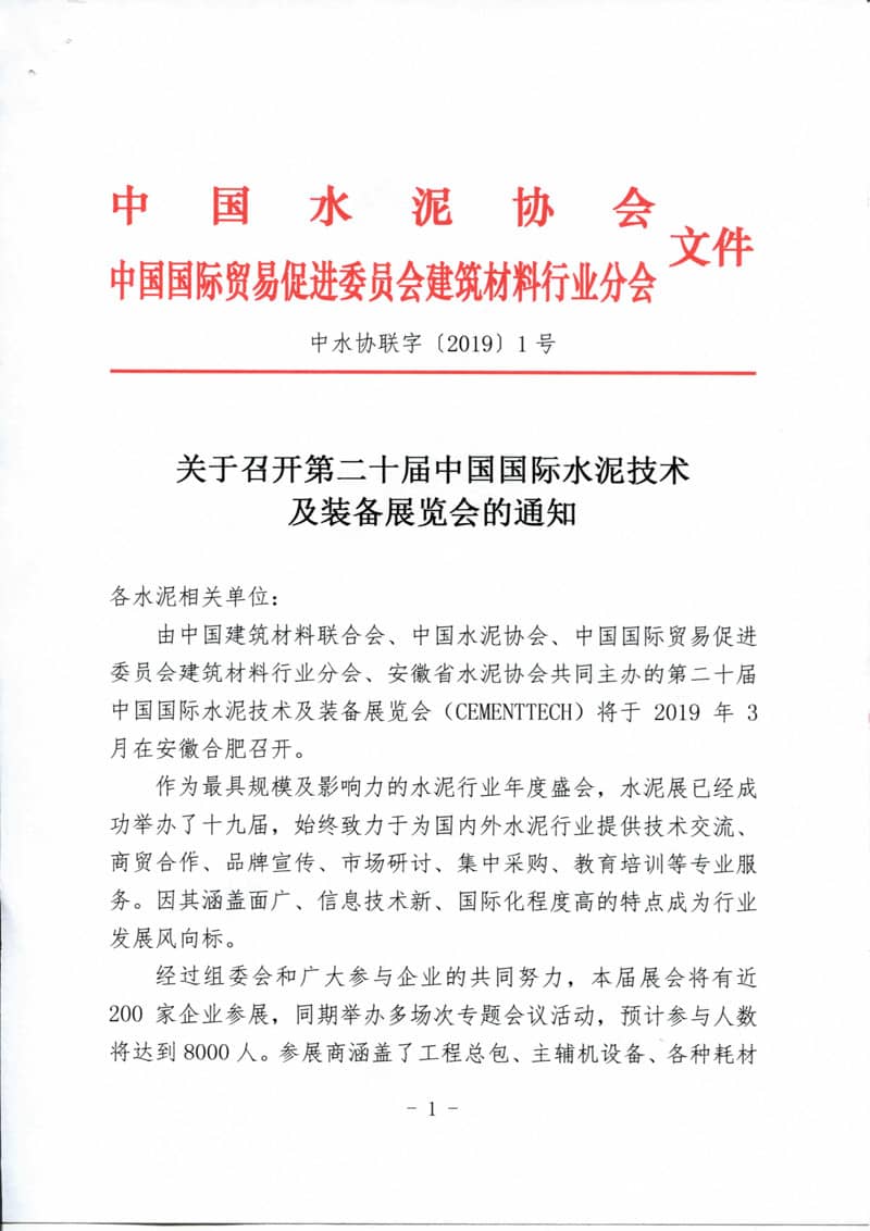 水泥人網消息:日前,中國水泥協會,中國國際貿易促進委員會建筑材料行業分會聯合發布了《關于召開第二十屆中國國際水泥技術及裝備展覽會的通知》(中水協聯字【2019】1號)。