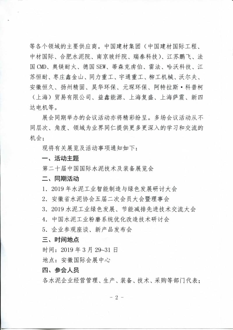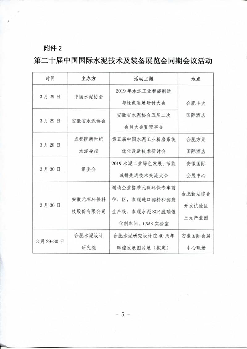 通知稱,由中國建筑材料聯合會、中國水泥協會、中國貿易促進委員會建筑材料行業分會、安徽省水泥協會共同主辦的第二十屆中國國際水泥技術及裝備展覽會(CEMENTTECH)將于2019年3月在安徽合肥召開。