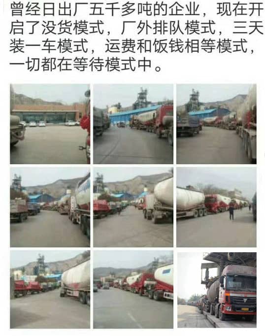 有當地水泥經銷商對當下的行情調侃道:“曾經日出廠5000多噸的水泥企業,開啟了沒貨模式,廠外排隊模式,三天裝一車模式,運費和飯錢相等模式,一切都在等待模式中。”