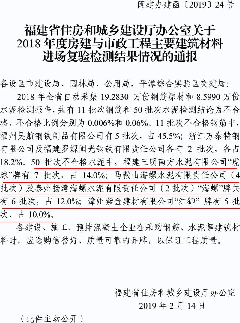 水泥人網消息近日,福建省住房和城鄉建設廳網站發布通報顯示,檢測發現50批次不合格水泥中,福建三明南方水泥有限公司“虎球”牌有7批次,占14.0%;馬鞍山海螺水泥有限責任公司(4批次)及泰州揚灣海螺水泥有限責任公司(2批次)“海螺”牌共有6批次,占12.0%;漳州紫金建材有限公司“紅獅” 牌有5批次,占10.0%。