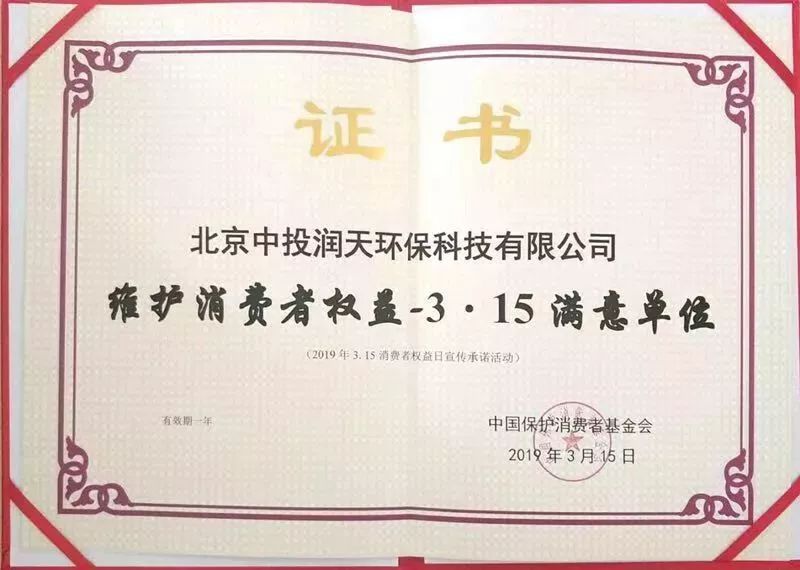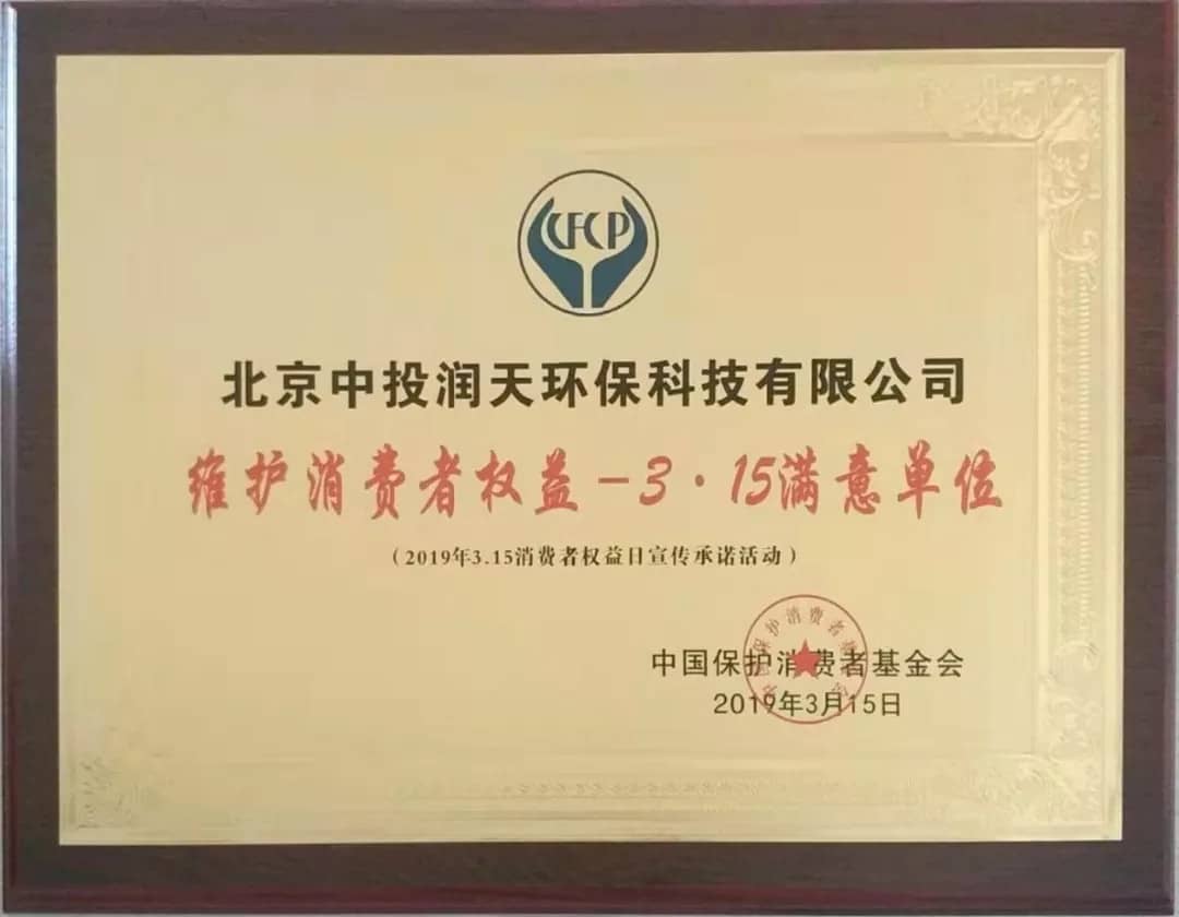 北京中投潤(rùn)天環(huán)保榮獲3.15維護(hù)消費(fèi)者權(quán)益滿意單位