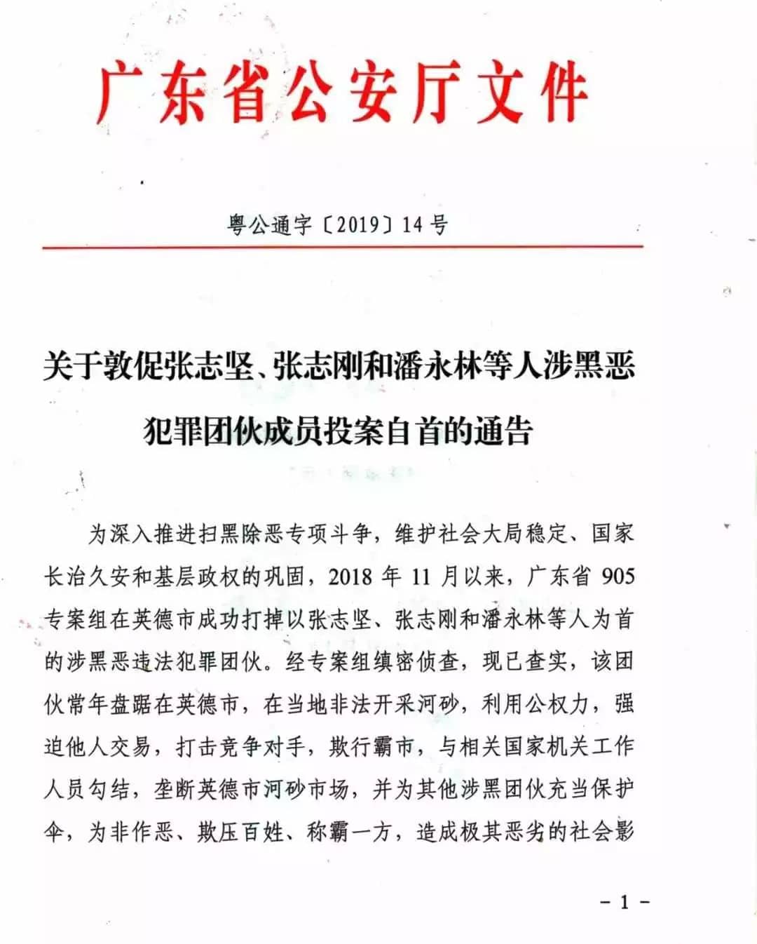 2018年11月15日,專案警示教育暨敦促投案自首動員大會在英德市公安局召開,同時在英德市張貼由省公安廳發布的《關于敦促張志堅、張志剛和潘永林等人涉黑惡違法犯罪團伙成員投案自首的通告》,深入群眾開展宣傳攻勢,形成強大的震懾。動員會前后,清遠市公安系統5名干警和1名監獄系統民警相繼向組織主動投案。