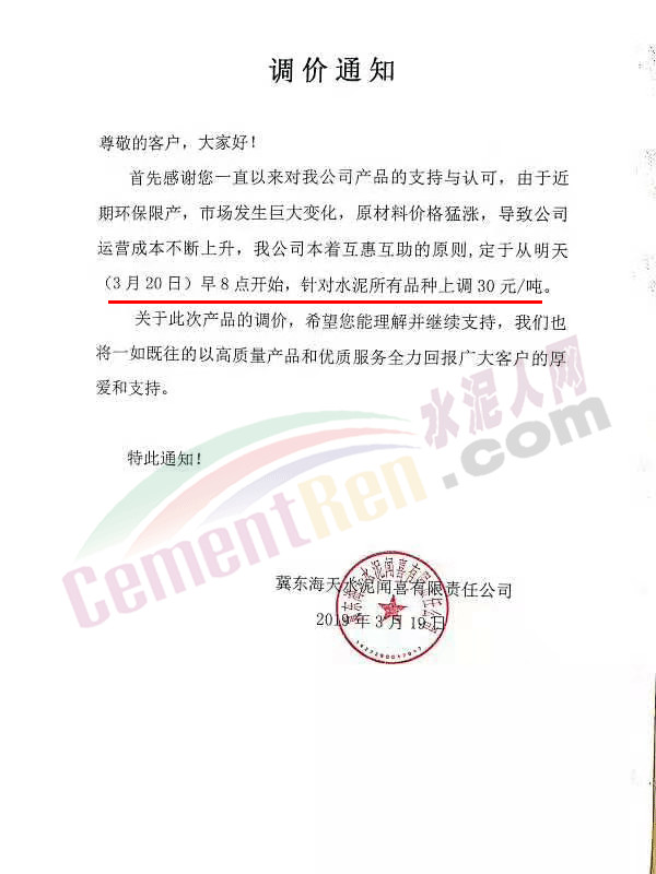冀東海天水泥聞喜有限責任公司調價通知稱由于近期環保限產,市場發生巨大變化,原材料價格猛漲,導致公司運營成本不斷上升。定于3月20日早8點開始針對水泥所有品種上調30元/噸。