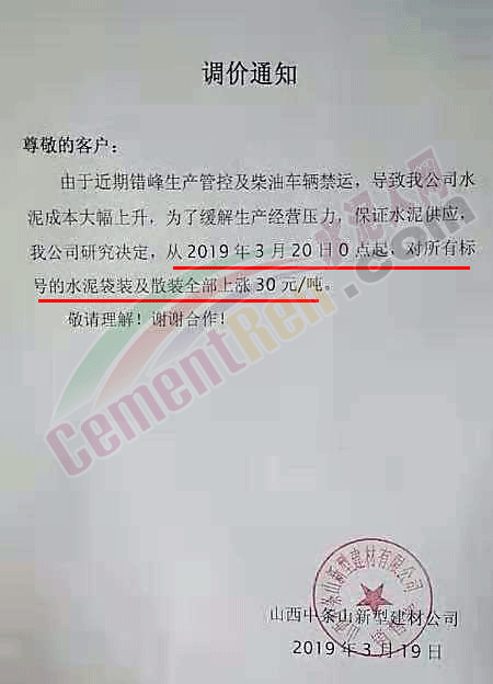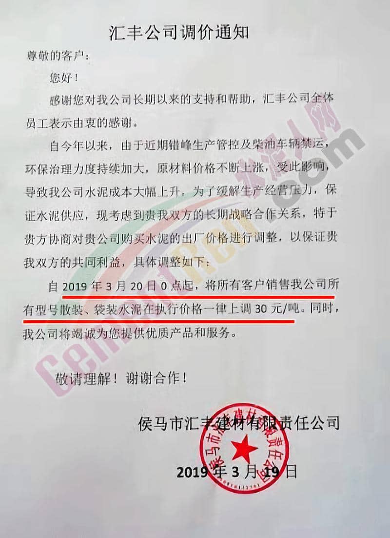 侯馬市匯豐建材有限責任公司調價通知稱自今年以來,由于近期錯峰生產管控及柴油車輛禁運,環保治理力度持續加大,原材料價格不斷上漲,受此影響導致公司水泥成本上升,為了緩解生產經營壓力,保證水泥供應。定于3月20日零點起上調所有型號散裝、袋裝水泥價格,上幅幅度為30元/噸。