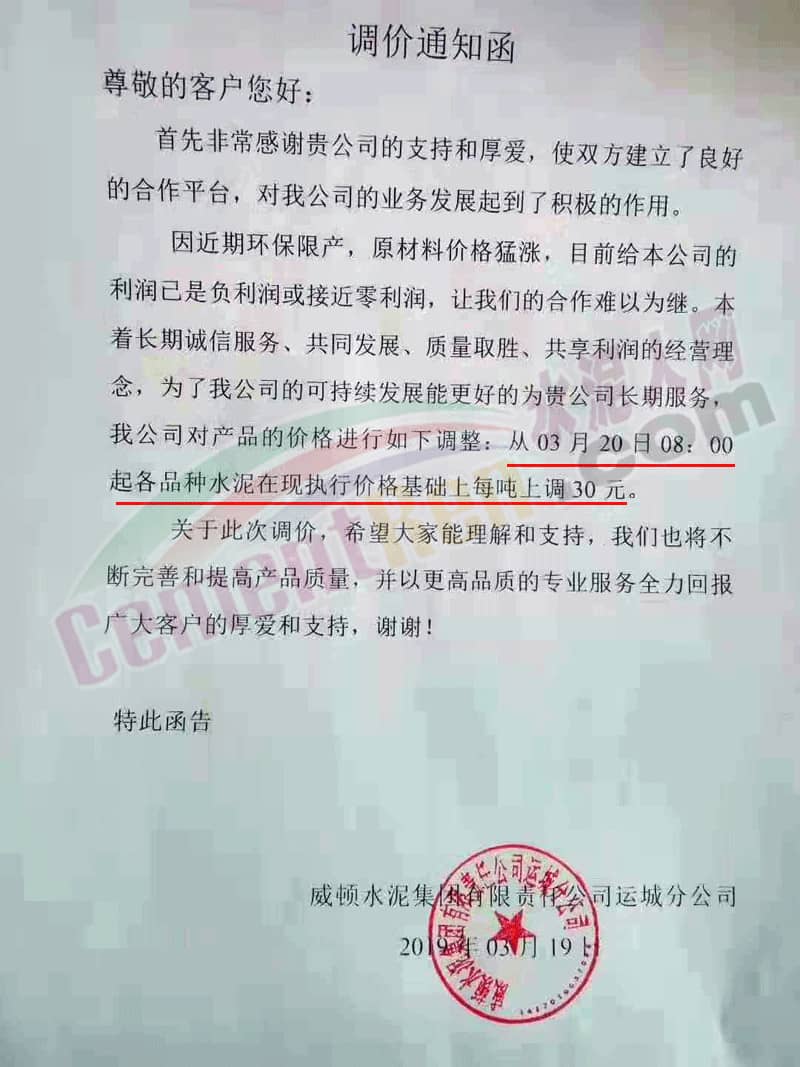 威頓水泥集團有限責任公司運城分公司調價通知函稱,因近期環保限產,原材料價格猛漲,目前公司利潤已是負利潤或接近零利潤。本著長期誠信服務,共同發展,質量取勝,共享利潤的經營理念。同時,為了公司的可持續發展,為客戶更好的服務,定于3月20日8時起各品種水泥在原執行價格基礎上每噸上調30元。