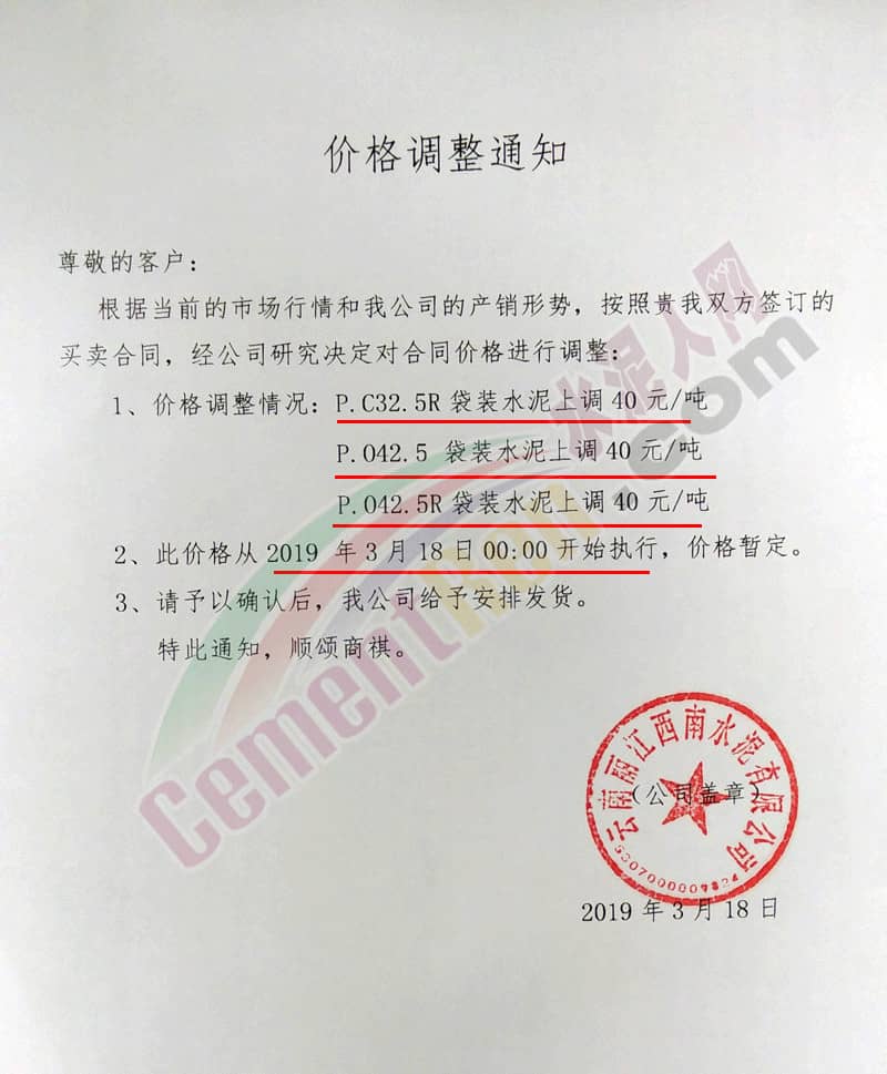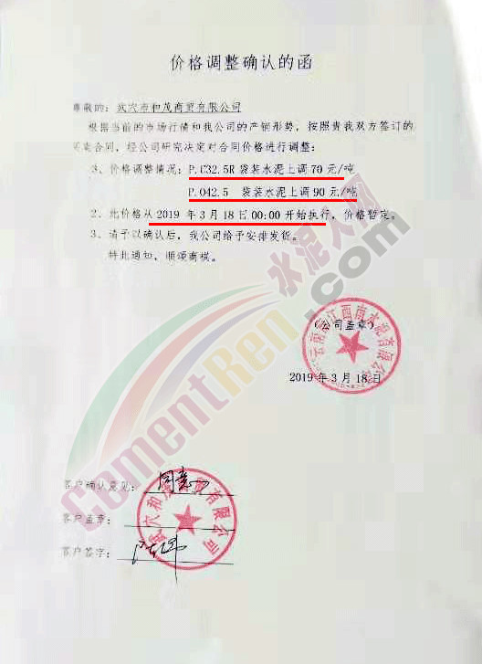 云南麗江西南水泥同期發給外圍經銷商的價格調整確認函稱,根據當前的市場行情和公司的產銷形勢。經公司研究決定從2019年3月18日00.00開始對合同價格進行調整:其中P.C32.5R 袋裝水泥上調70元/噸。P.042.5 袋裝水泥上調90元/噸。