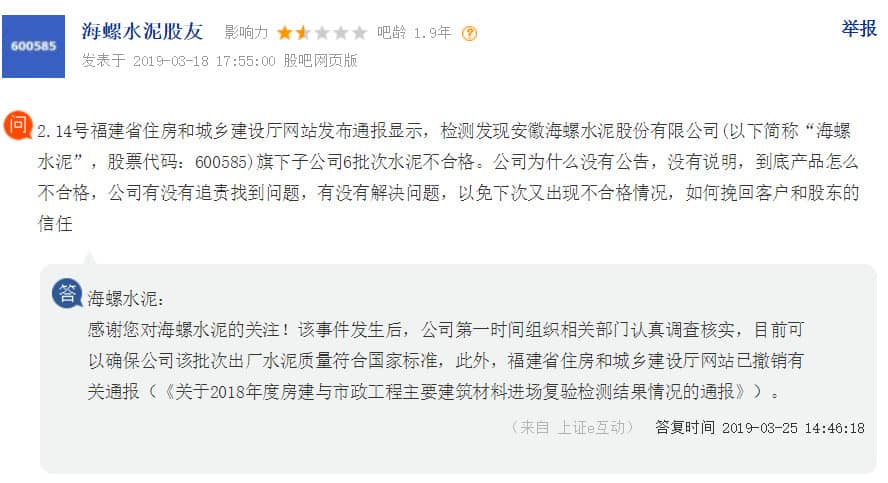 日前,有投資者向海螺水泥(600585)提問,2.14號福建省住房和城鄉建設廳網站發布通報顯示,檢測發現安徽海螺水泥股份有限公司(以下簡稱“海螺水泥”,股票代碼:600585)旗下子公司6批次水泥不合格。公司為什么沒有公告,沒有說明,到底產品怎么不合格,公司有沒有追責找到問題,有沒有解決問題,以免下次又出現不合格情況,如何挽回客戶和股東的信任。