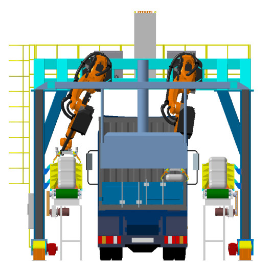 袋裝水泥智能裝車系統,通過伺服系統控制機器人抓手上下擺動來進行裝車碼垛,這樣可以省時省力。此過程完全自動化,不需要人工輔助,是現代生產線裝車自動化的理想設備。袋裝水泥智能裝車系統由桁架、工業機器人、控制系統、收塵系統等部分組成。裝載前,待裝載車輛進入指定位置,通過桁架上的紅外激光掃描,確定車輛的大小及停放位置,桁架通過軌道移動到車輛貨箱前端裝包區域。