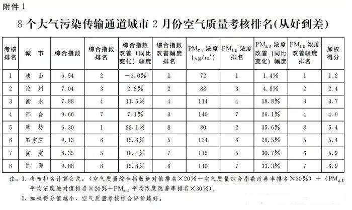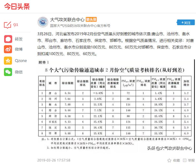 日前,國家大氣污染防治攻關聯合中心公布:3月26日,河北省發布2019年2月份空氣質量從好到差的城市依次是:唐山市、滄州市、衡水市、邢臺市、廊坊市、石家莊市、保定市、邯鄲市。根據空氣質量情況,進行相關獎懲:對唐山市、滄州市、衡水市分別獎勵100萬元、80萬元、60萬元;對邯鄲市、保定市、石家莊市分別扣減100萬元、80萬元、60萬元。