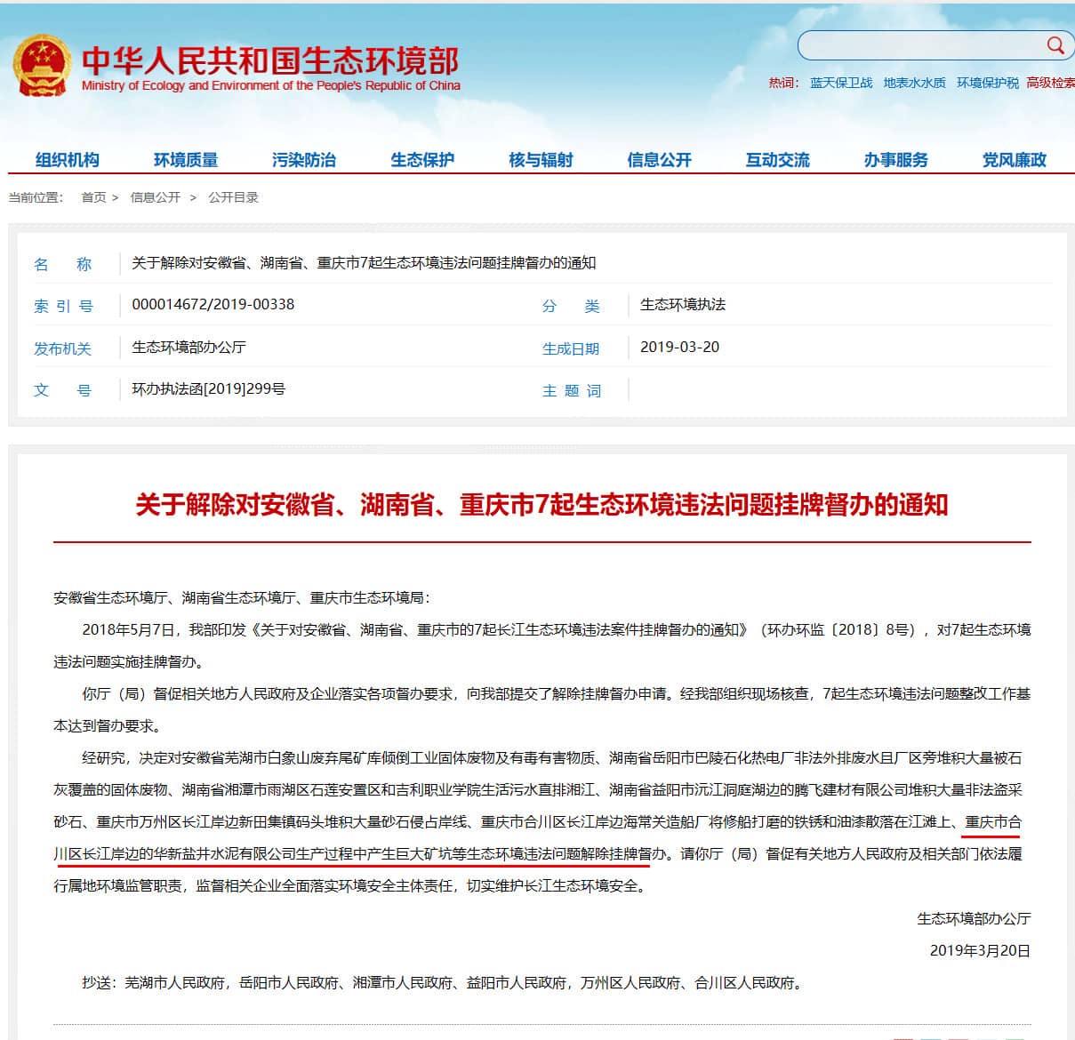 通知稱:2018年5月7日,生態環境部印發通知,對安徽省、湖南省、重慶市的7起長江生態環境違法案件實施掛牌督辦。日前,安徽省生態環境廳、湖南省生態環境廳、重慶市生態環境局向生態環境部申請解除掛牌督辦。