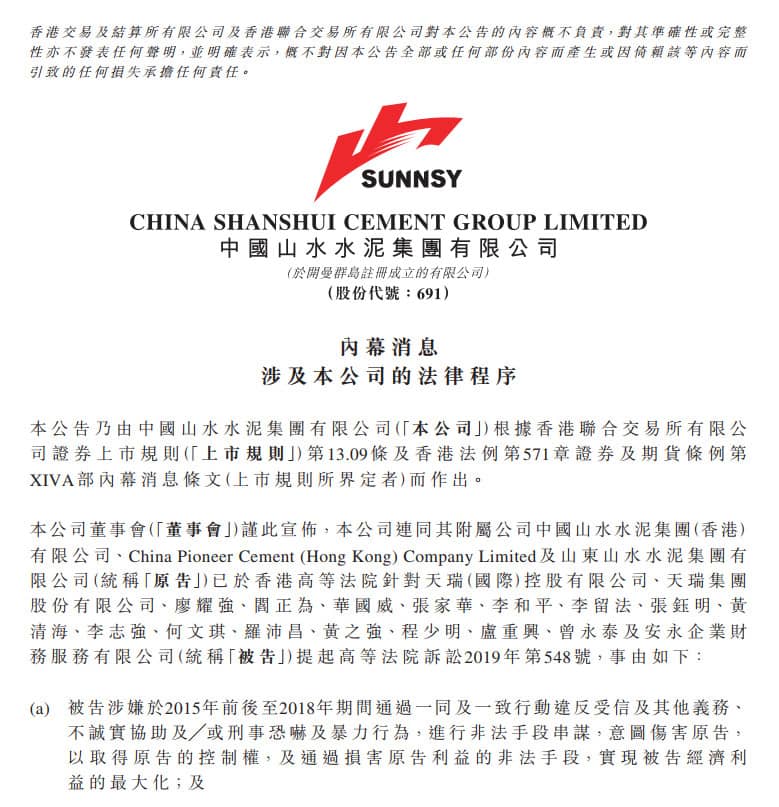 山水水泥(00691)公布,該公司連同其附屬公司中國山水水泥集團(香港)有限公司、China Pioneer Cement(Hong Kong)Company Limited及山東山水水泥集團有限公司(統(tǒng)稱原告)已于香港高等法院針對天瑞(國際)控股有限公司、天瑞集團股份有限公司、廖耀強、閻正為、華國威、張家華、李和平、李留法、張鈺明、黃清海、李志強、何文琪、羅沛昌、黃之強、程少明、盧重興、曾永泰及安永企業(yè)財務(wù)服務(wù)有限公司(統(tǒng)稱被告)提起高等法院訴訟2019年第548號。