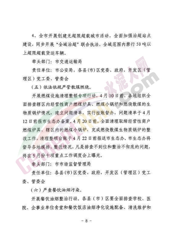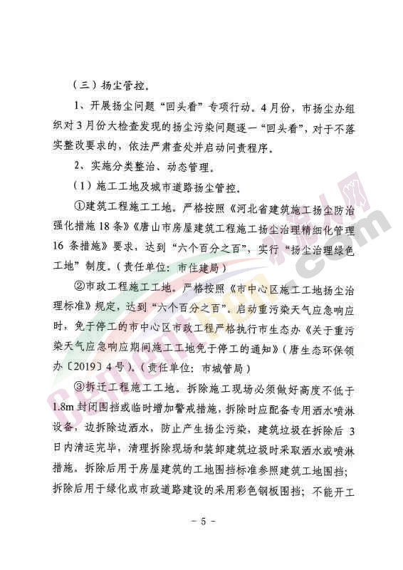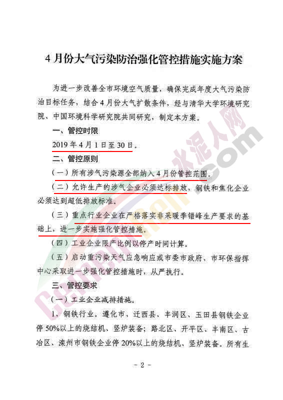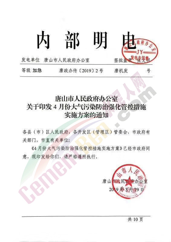 水泥人網最新消息:日前,唐山市人民政府辦公室發(fā)布內部明電唐政辦傳【2019】2號《關于印發(fā)4月份大氣污染防治強化管控措施實施方案的通知》稱,《4月份大氣污染防治強化管控措施實施方案》已經市政府同意。