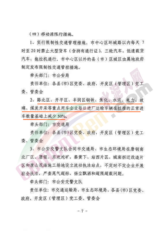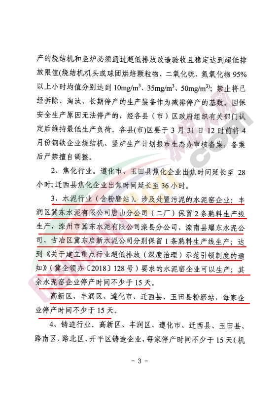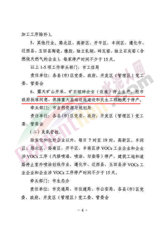 ⑸高新區(qū)、豐潤區(qū)、遵化市、遷西縣、玉田縣粉磨站,每家企業(yè)停產時間不少于15天。