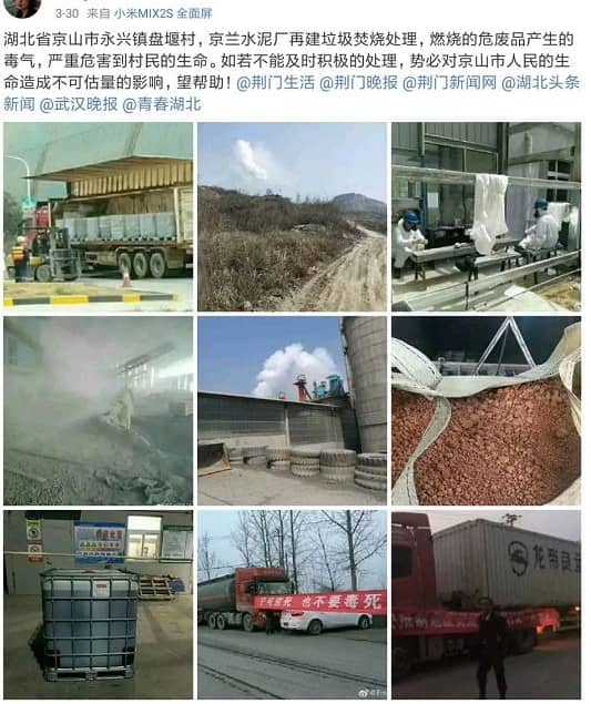 同一日來自于新浪微博的一條消息稱,湖北省京山市永興鎮(zhèn)盤堰村,京蘭水泥廠再建垃圾焚燒處理,燃燒的危廢品產生的毒氣,嚴重危害到村民的生命。如若不能及時積極的處理,勢必對京山市人民的生命造成不可估量的影響,望幫助。