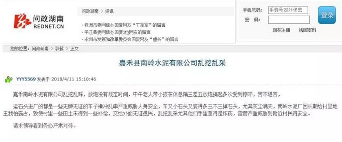 針對南嶺水泥有限公司的環境污染問題,有網友早在2016年8月3日在紅網發布了題為《嘉禾縣南嶺水泥廠曾讓周邊住戶苦不堪言又要恢復生產》的曝光帖,聲稱住在該水泥廠附近的居民被水泥廠的粉塵和噪聲污染折磨的猶如驚弓之鳥。