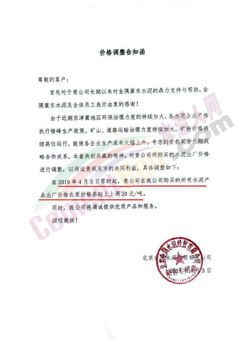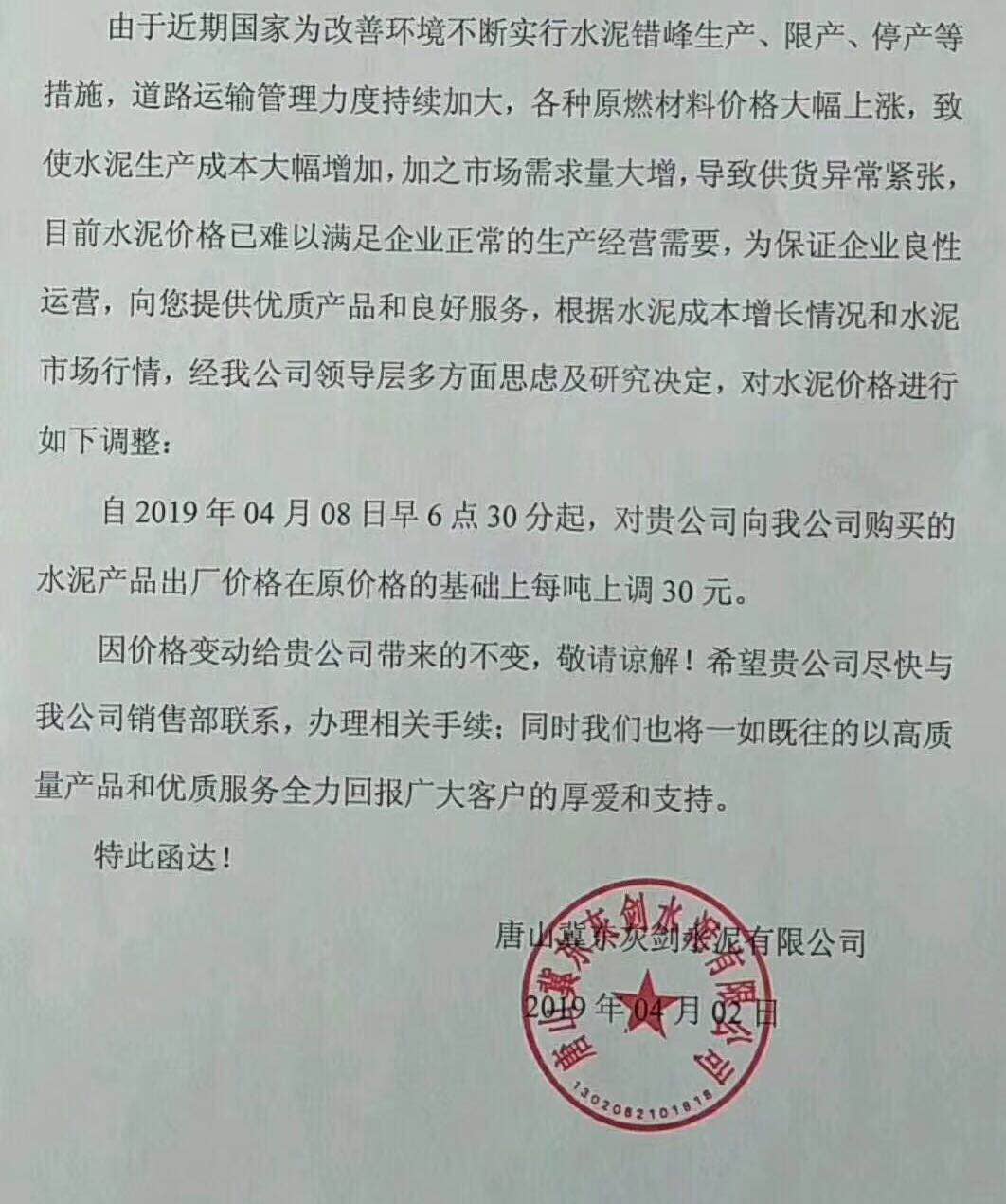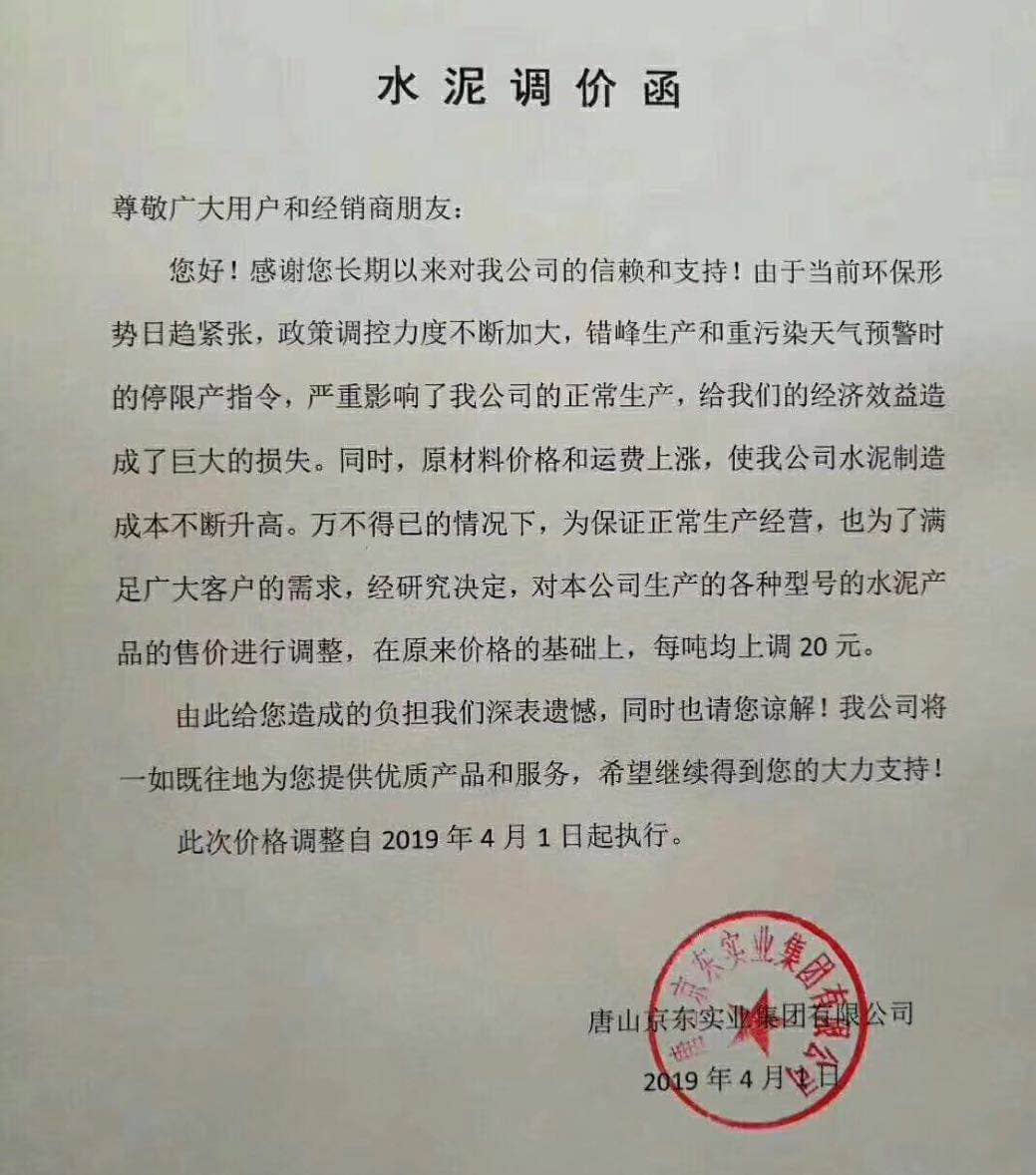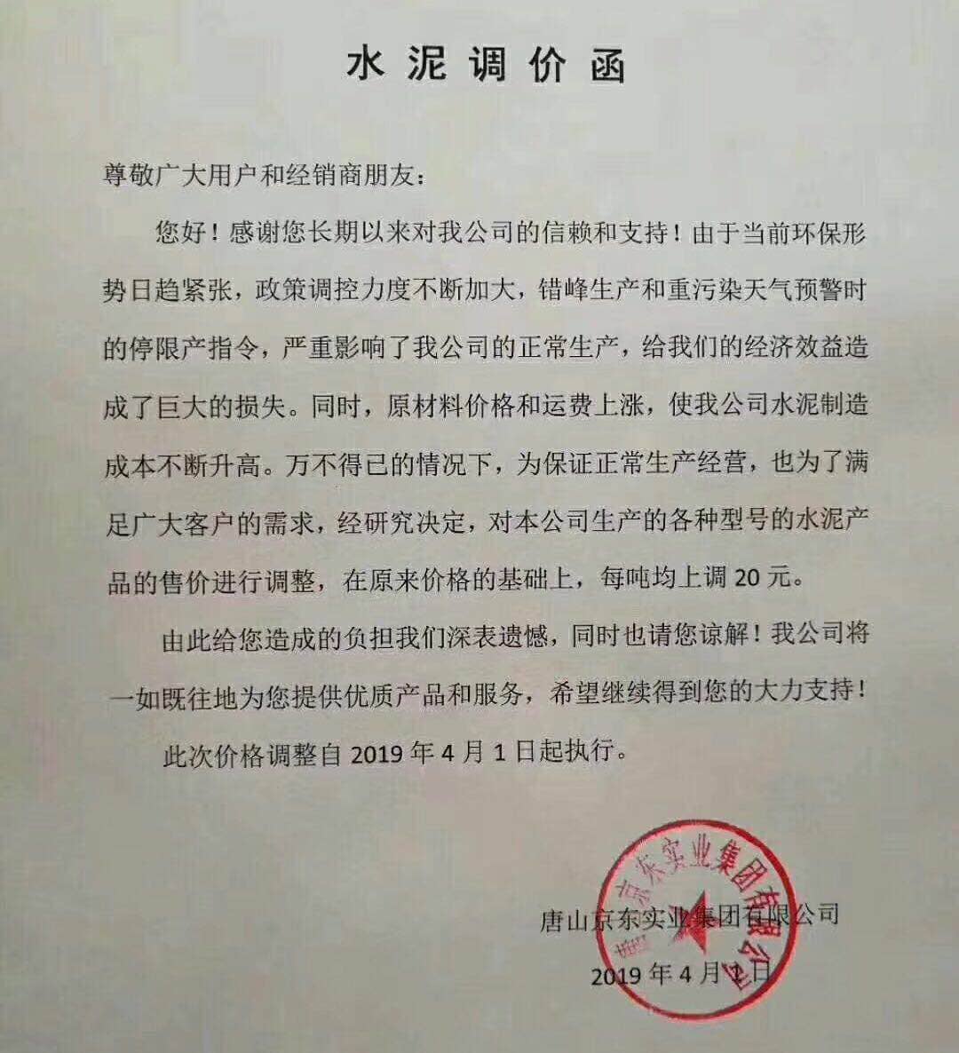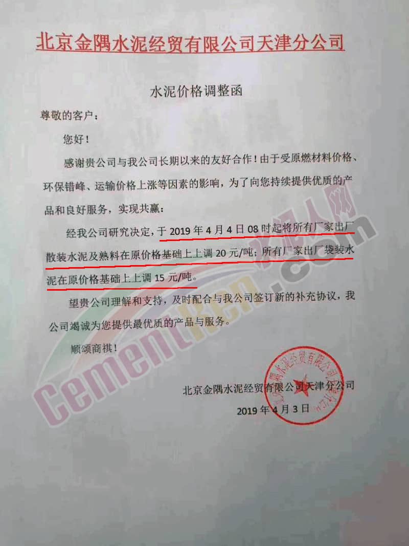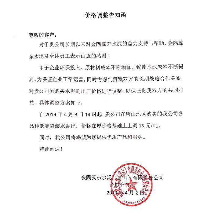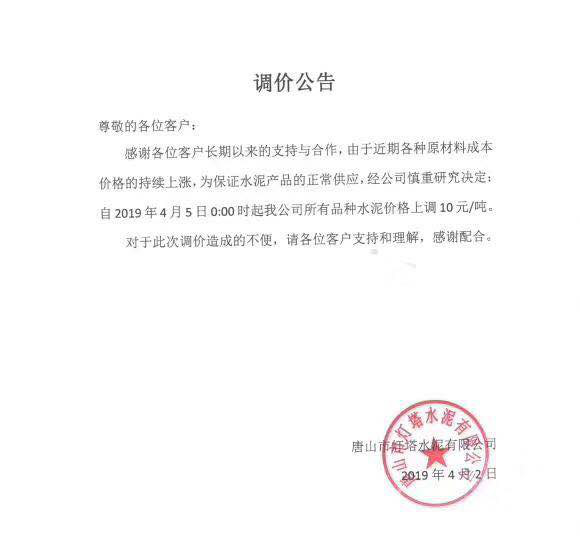 北京金隅水泥經貿有限公司天津分公司水泥價格調整函稱,由于受原燃材料價格、環保錯峰、運輸價格上漲等因素的影響。經公司研究決定,于4月4日8時起將所有廠家出廠散裝水泥及熟料在原價格基礎上上調20元/噸。所有廠家出廠袋裝水泥在原價格基礎上上調15元/噸。