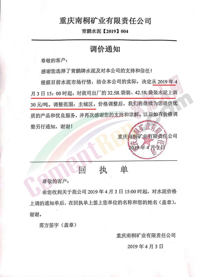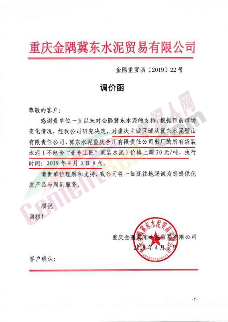 同期,重慶區域主導企業亦通知上調水泥價格,重慶金隅冀東水泥貿易有限公司調價函稱,根據目前市場變化情況 ,經公司研究決定 ,對重慶主城區從冀東水泥璧山有限公司、冀東水泥重慶合川有限責任公司出廠的所有袋裝水泥(不包含“壹號工匠”家裝水泥)價格上調20元/噸,執行時間4月3日8點。
