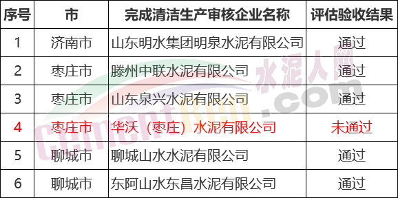 近日,山東省生態環境廳公布了2018年清潔生產審核評估驗收情況,所列六家水泥企業中位于山東棗莊市的華沃(棗莊)水泥有限公司未通過評估驗收,需要重新開展清潔生產審核。