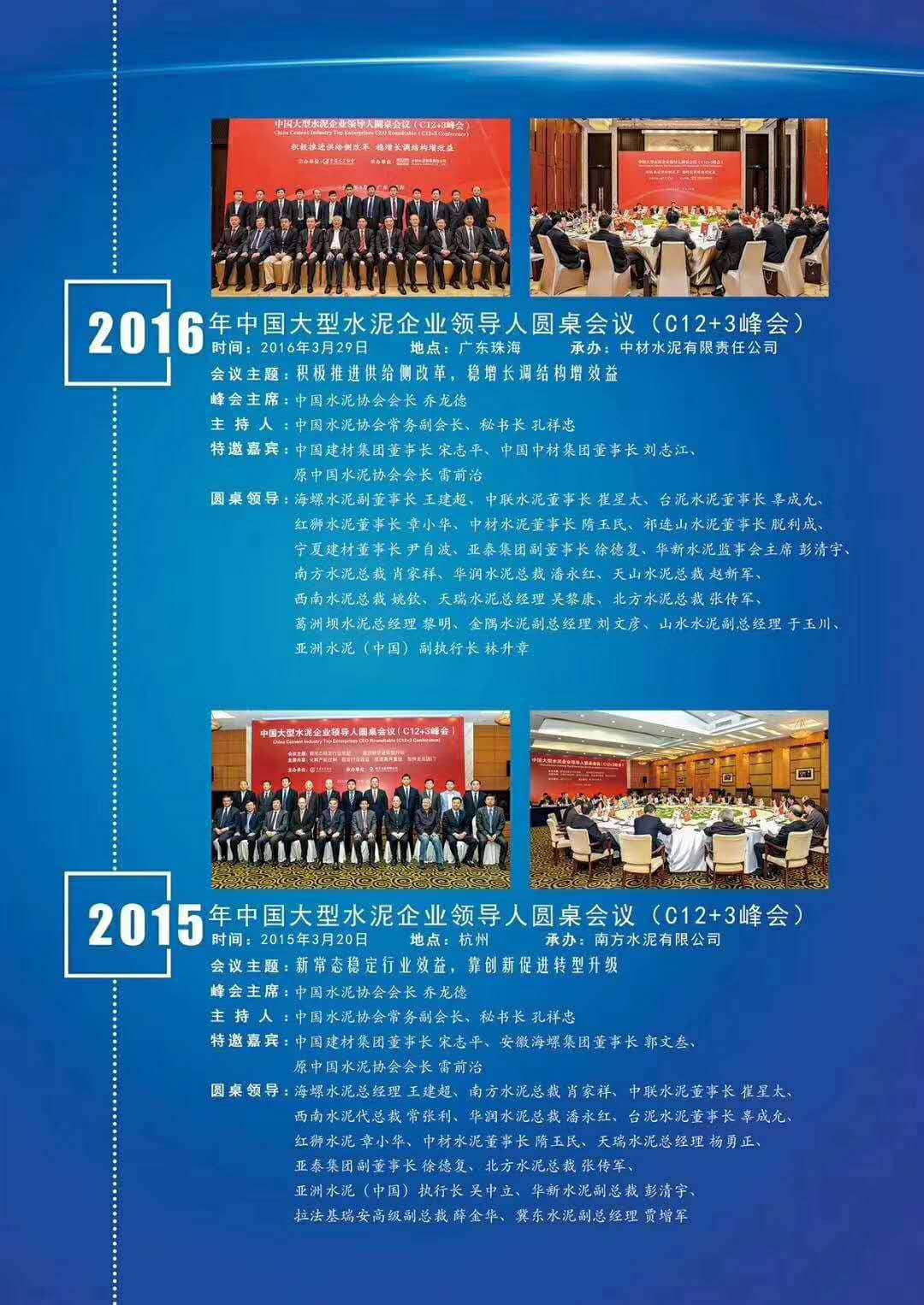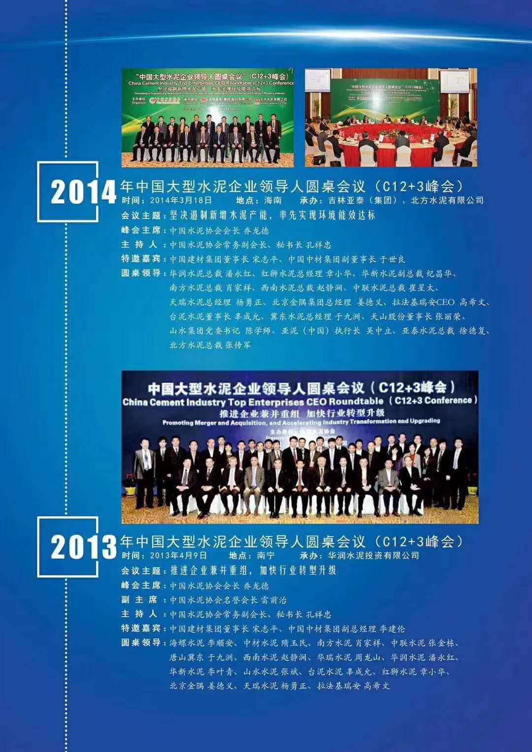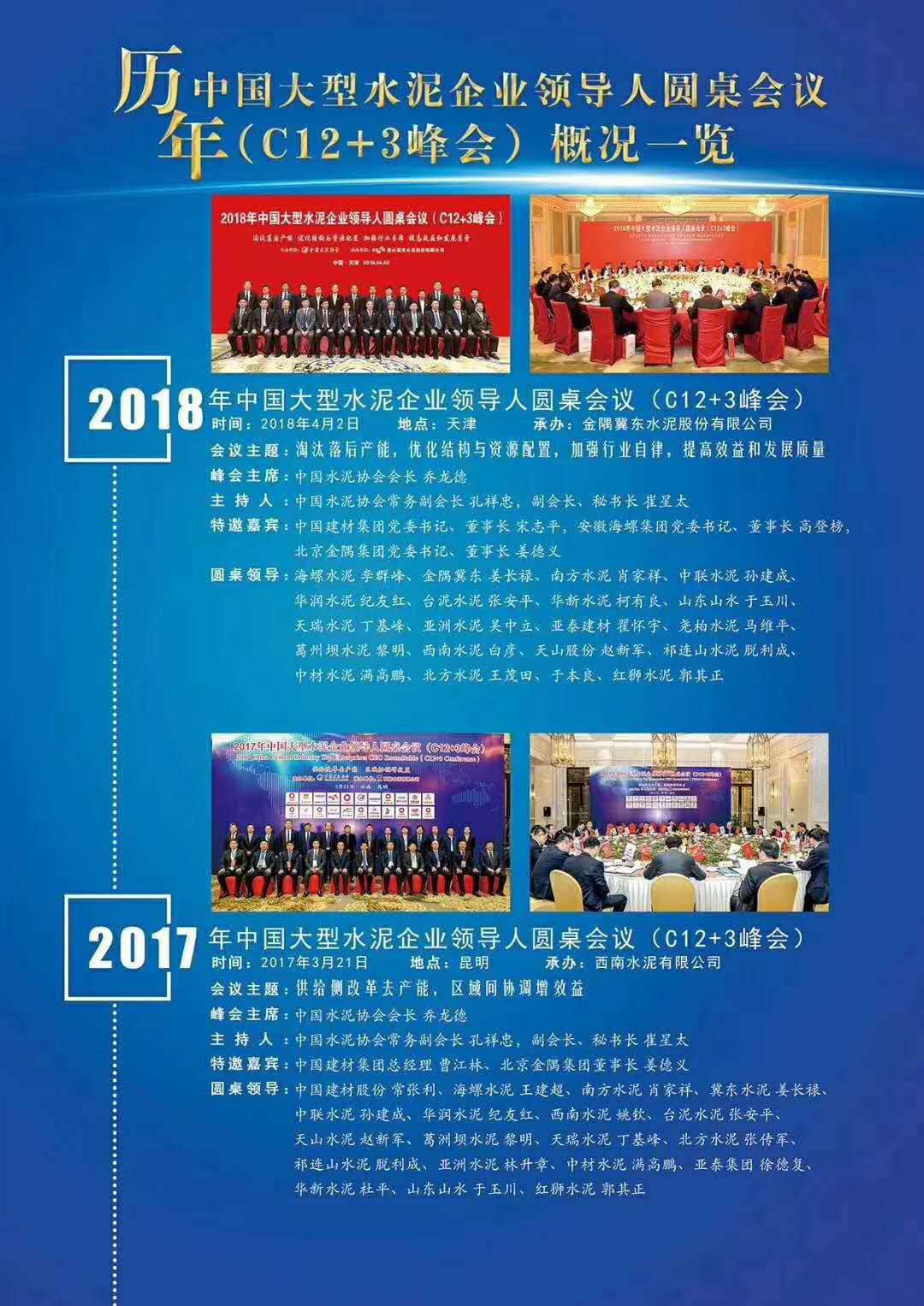 據水泥人網了解,中國大型水泥企業(yè)領導人圓桌會議(C12+3峰會)自2012年以來每年一屆,通常在每年的三月或四月份召開。