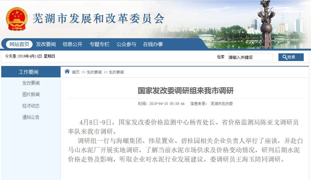 水泥人網消息:4月8日-9日,國家發改委價格監測中心楊青處長、安徽省價格監測局陳亞戈調研員率隊到蕪湖市調研。