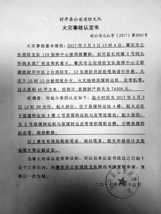 2017年3月,封開縣長崗鎮9號碼頭華潤水泥廠有皮帶機著火,過火面積40平方米,經統計,直接財產損失為74300元。