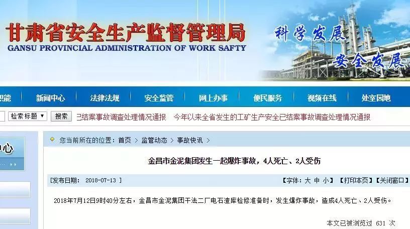 2018年7月12日9時40分左右,金昌水泥(集團)有限責(zé)任公司新型干法水泥二廠電石渣庫發(fā)生一起爆炸事故,造成現(xiàn)場4人死亡、2人受傷,直接經(jīng)濟損失494萬元。后經(jīng)調(diào)查認定金泥集團公司干法二廠“7.12”爆炸事故是由于違章指揮、違章作業(yè)導(dǎo)致的一起較大生產(chǎn)安全責(zé)任事故。