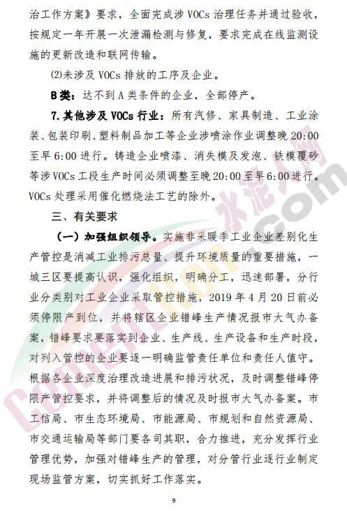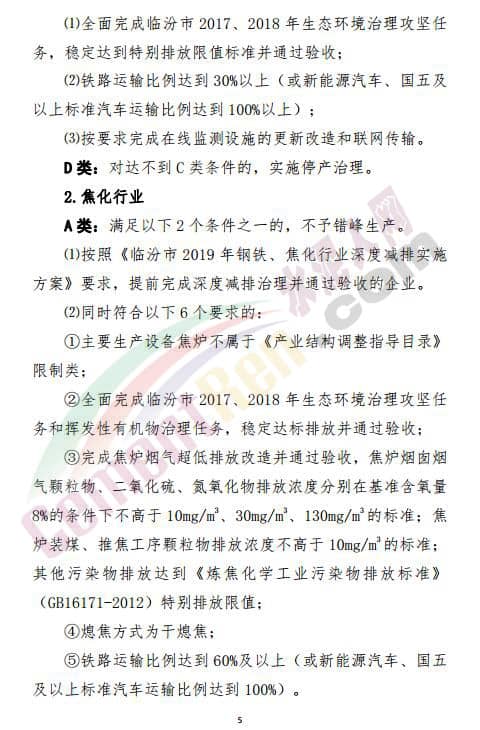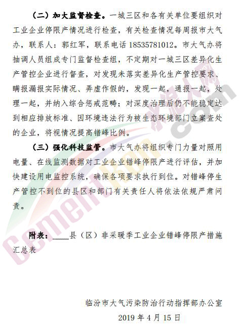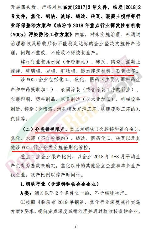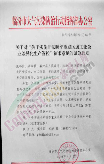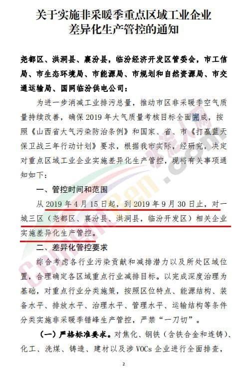 日前,山西臨汾市下達非采暖季重點區域差異化生產管控的通知,從2019年4月15日起,到2019年9月30日止,對一城三區(堯都區、襄汾縣、洪洞縣,臨汾開發區)相關企業實施差異化生產管控。嚴格對照臨發[2017]3號文件, 臨發[2018]2號文件,焦化、鋼鐵、洗煤、鑄造、磚瓦、混凝土攪拌等行業環保整治方案和《臨汾市2018年重點行業揮發性有機物(VOCs)污染防治工作方案》。重點對鋼鐵(含連鑄和鐵合金)、焦化、水泥(不含粉磨站)、鑄造其他涉VOCs行業分類實施差別化管控。