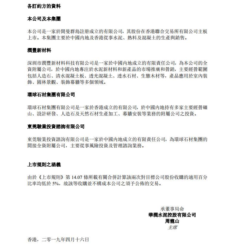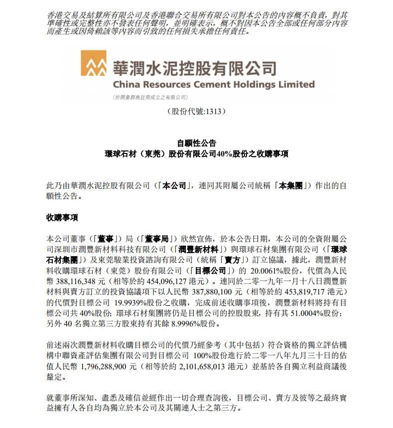華潤水泥控股公告,該公司的全資附屬公司深圳市潤豐新材料科技有限公司與環球石材集團有限公司及東莞駿業投資諮詢有限公司訂立協議,據此,潤豐新材料收購環球石材(東莞)股份有限公司(目標公司)的20.0061%股份,代價為人民幣3.88億元。