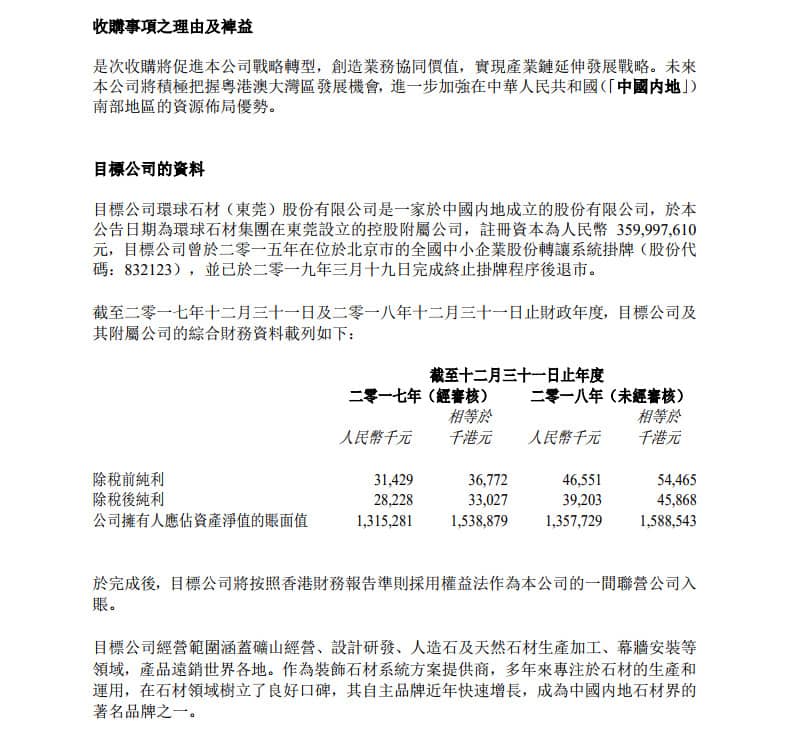 據悉,目標公司環球石材(東莞)股份有限公司是一家于中國內地成立的股份有限公司,于公告日期為環球石材集團在東莞設立的控股附屬公司,注冊資為人民幣3.6億元,目標公司曾于2015年在位于北京市的全國中小企業股份轉讓系統掛牌,并已于2019年3月19日完成終止掛牌程序后退市。