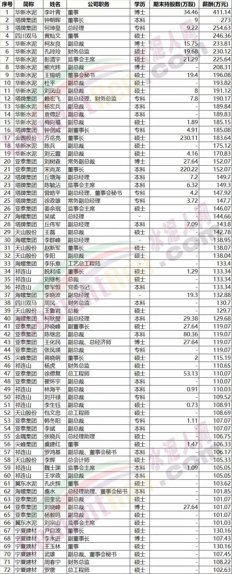 據(jù)不完全統(tǒng)計(jì),上述水泥行業(yè)上市公司中72位高管的年薪為1.05億元,平均每人每年為147萬。