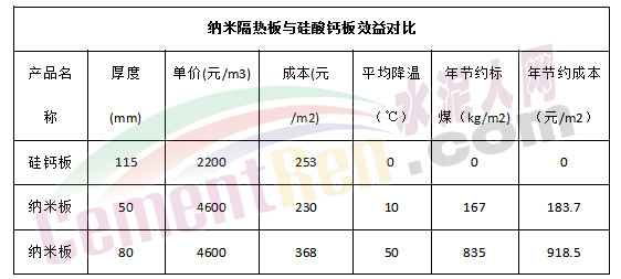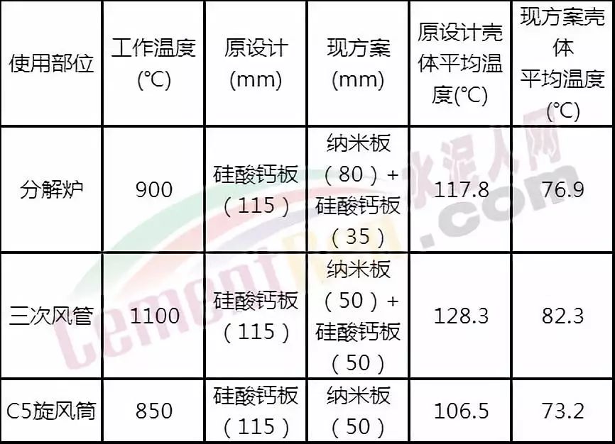 二、如果使用50mm納米板替代115mm硅酸鈣板,每平方米將增加0.065立方米有效容積,5000T/D生產線分解爐面積大約850平方米,則理論上分解爐大約增加850*0.065=55立方米的有效容積。這為水泥窯提高熟料產量提供了最大可能。