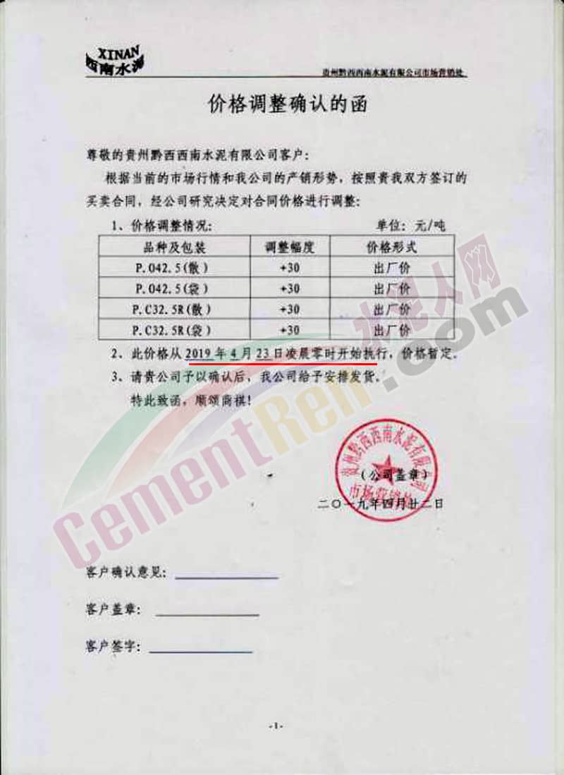 同期,西南地區(qū)貴州省黔西南水泥有限公司市場(chǎng)營(yíng)銷處發(fā)布價(jià)格調(diào)整確認(rèn)函稱根據(jù)當(dāng)前的市場(chǎng)行情和公司的產(chǎn)銷形勢(shì),各標(biāo)號(hào)水泥自23日起上調(diào)30元/噸。