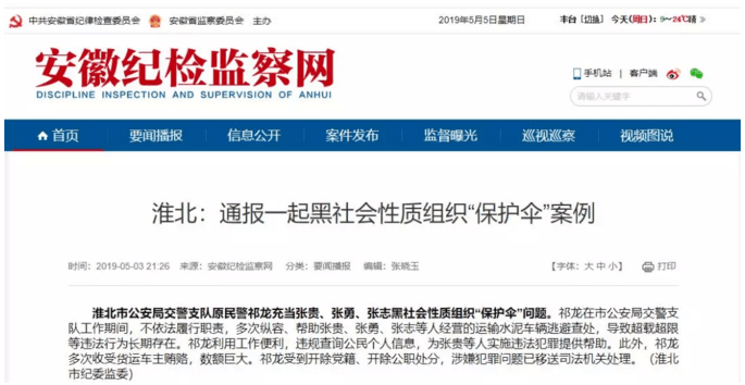 日前,安徽紀檢監察網通報一起黑社會性質組織“保護傘”案例稱:淮北市公安局交警支隊原民警祁龍充當張貴、張勇、張志黑社會性質組織“保護傘”問題。