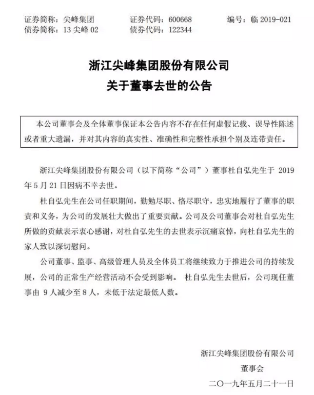 尖峰集團股份有限公司5月21日關(guān)于董事去世的公告原文如下: