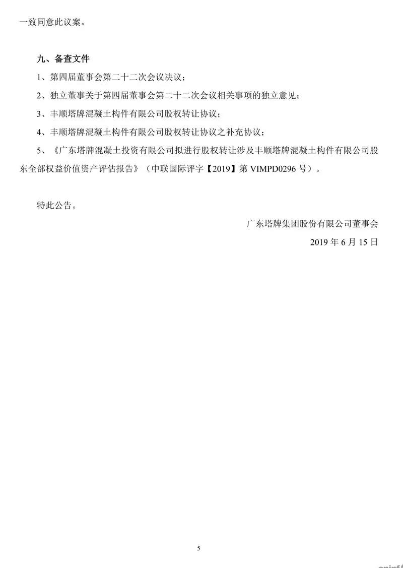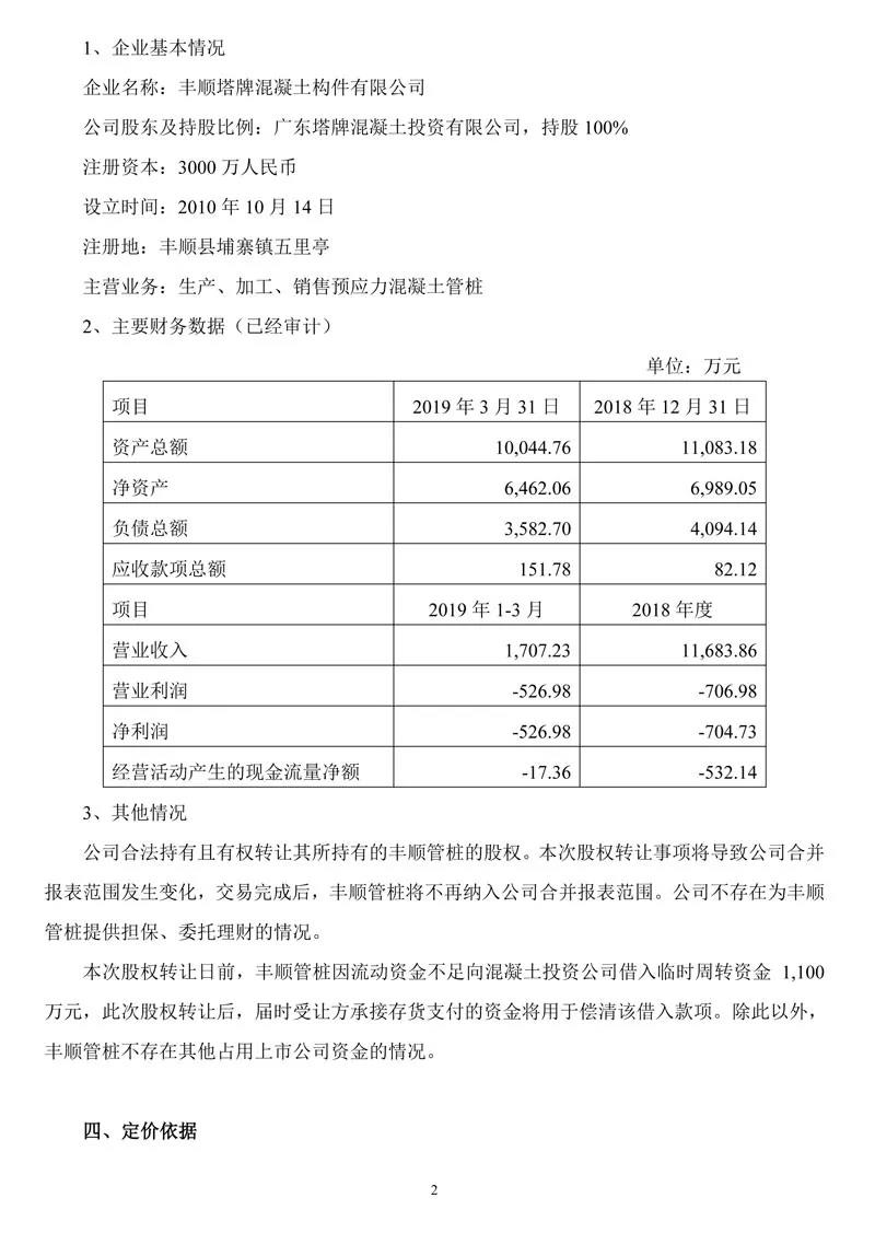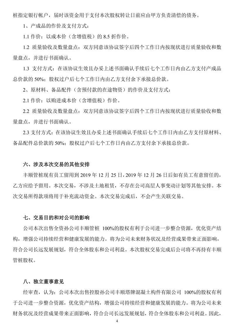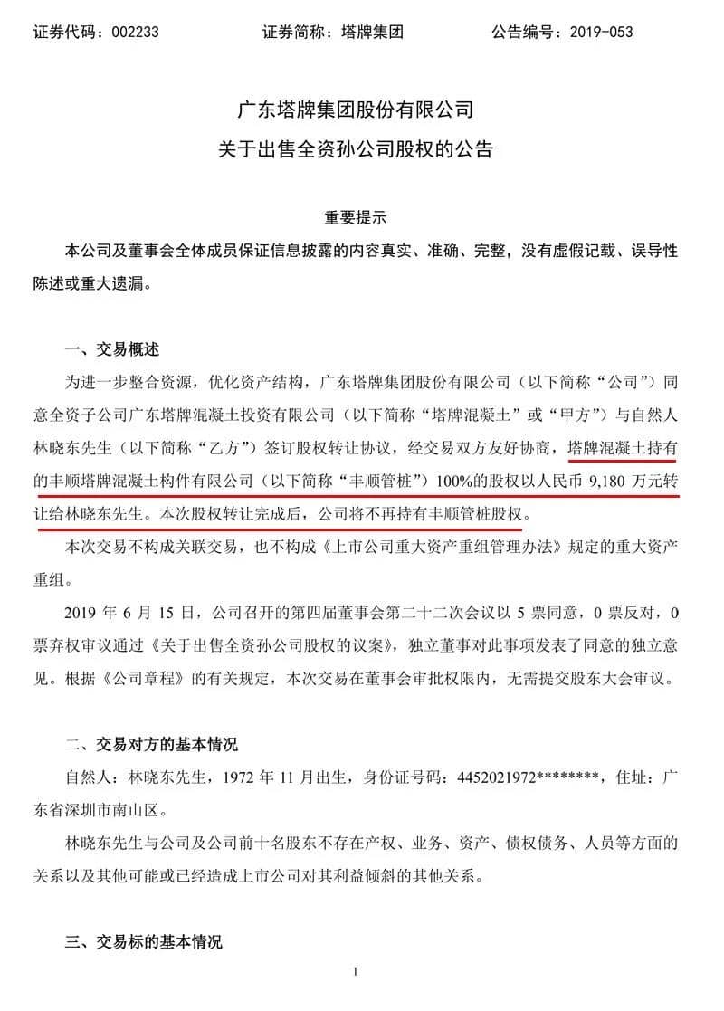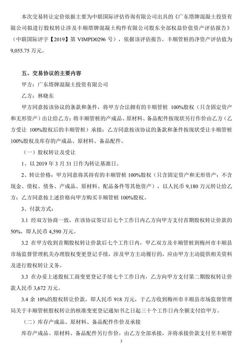 塔牌集團公告披露,為進一步整合資源,優化資產結構,公司同意全資子公司廣東塔牌混凝土投資有限公司與自然人林曉東先生簽訂股權轉讓協議,經交易雙方友好協商,塔牌混凝土持有的豐順塔牌混凝土構件有限公司100%的股權以人民幣9,180萬元轉讓給林曉東先生。本次股權轉讓完成后,公司將不再持有豐順管樁股權。