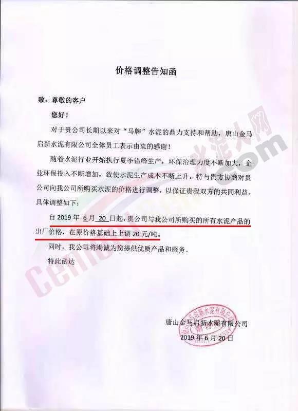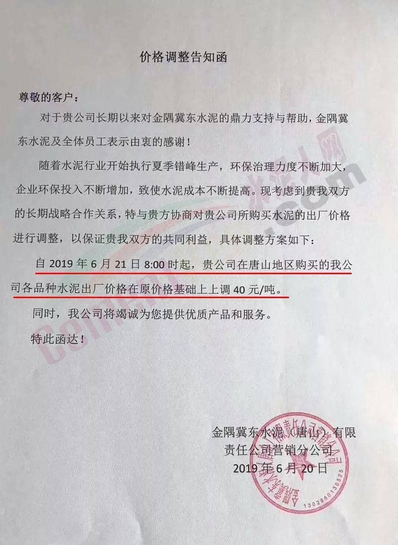 冀東水泥調價通知稱:隨著水泥行業開始執行夏季錯峰生產,環保治理力度不斷加大,企業環保投入不斷增加,致使水泥成本不斷提高。特與客戶協商對其購買水泥的出廠價格進行調整,以保證雙方共同利益。自6月21日8時起,在唐山地區購買的各品種水泥出廠價在原價格基礎上上調20元/噸。