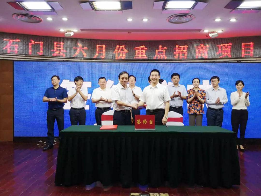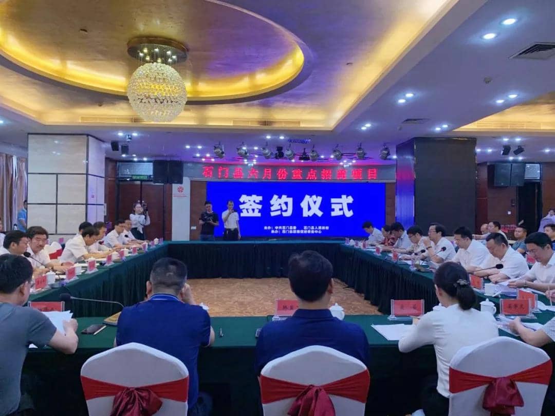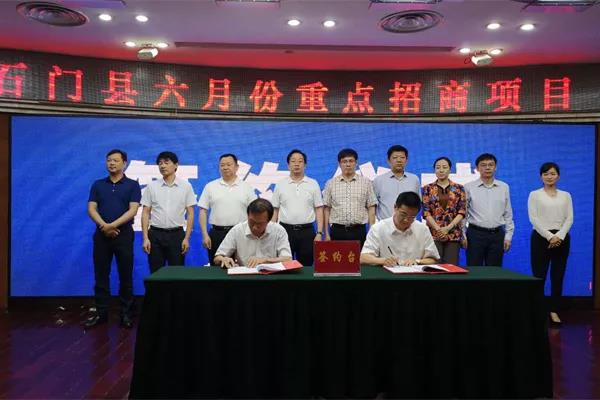簽約儀式在石門縣堯業國際大酒店舉行。海螺創業總經理紀勤應和石門縣委副書記、縣長郭碧勛分別代表雙方簽署投資協議。常德市人大常委會副主任、石門縣委書記譚本仲,縣委常委、常務副縣長張凱及其他縣級領導、縣相關縣直機關負責人;海螺創業安全環保部部長、戰略企劃部副部長章邦志,海螺設計院總工程師汪克春、澧縣海創總經理陳遠志等出席并見證了簽約儀式。