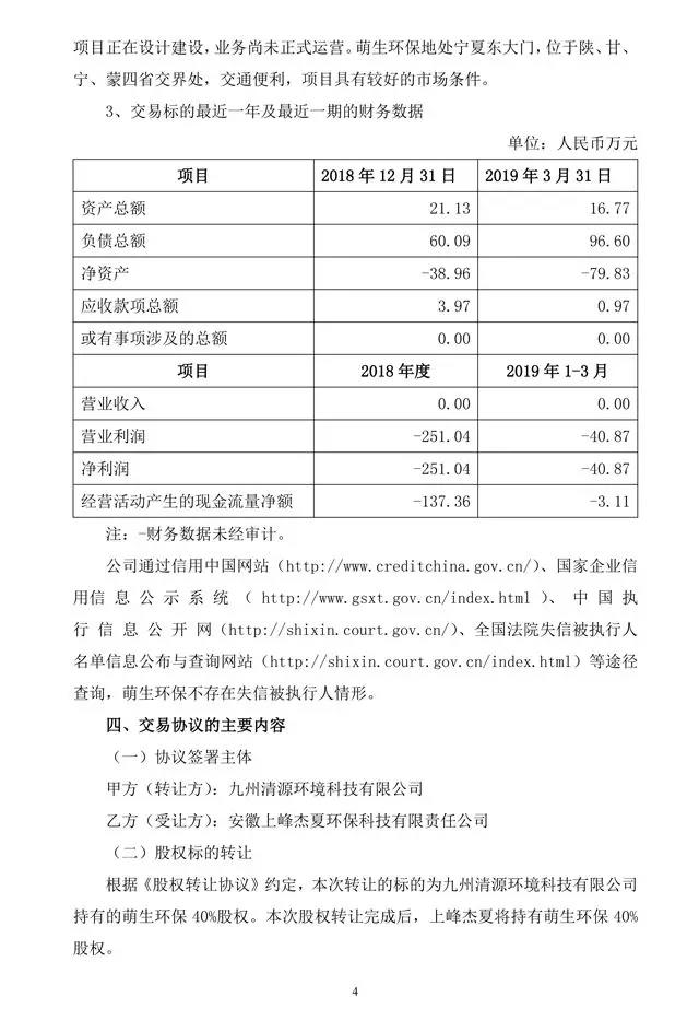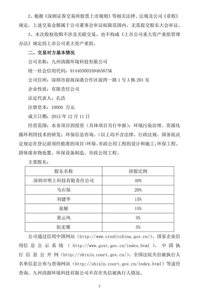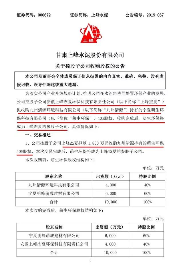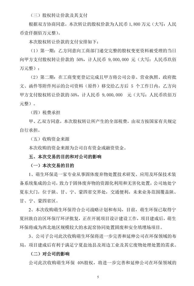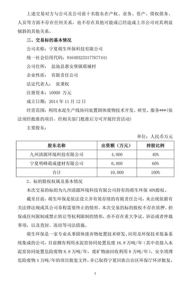 萌生環保是一家專業從事固體廢棄物處置技術研發、應用及環保技術裝備系統集成的公司,致力于固體廢棄物的資源化利用和無害化處置,公司地處寧夏東大門,位于陜、甘、寧、蒙四省交界處,交通便利,未來業務范圍覆蓋陜、甘、寧、蒙四省區。本次收購萌生環保符合公司戰略計劃和布局,目前,萌生環保已取得寧夏回族自治區環保廳環評批復,正在開展項目設計建設工作,項目建成后,萌生環保將成為西北地區規模較大的水泥窯協同處置固廢和安全填埋場項目。公告原文如下: