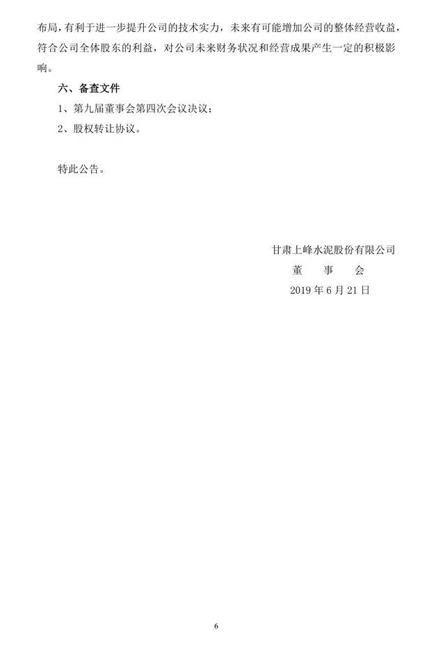 為落實公司產業升級戰略計劃,推進公司在水泥窯協同處置環保產業的發展,公司控股子公司安徽上峰杰夏環保科技有限責任公司(以下簡稱“上峰杰夏”)擬以1800萬股收購九州清源環境科技有限公司(以下簡稱“九州清源”)持有的寧夏萌生環保科技有限公司(以下簡稱“萌生環保”)40%股權,收購完成后,萌生環保將成為上峰杰夏的參股子公司。