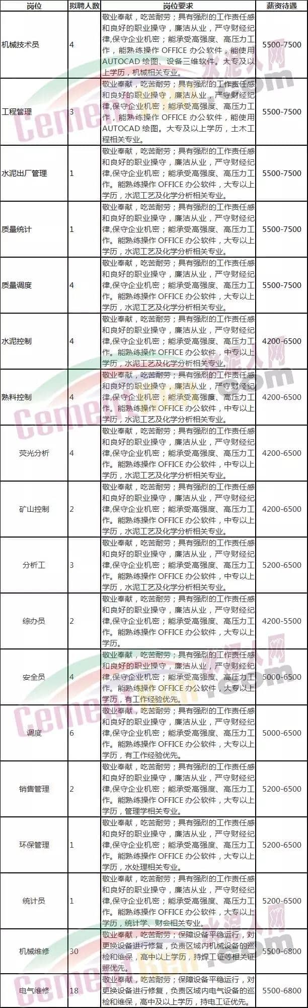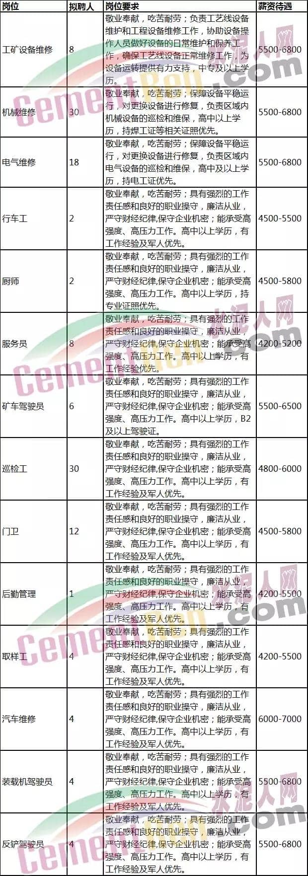 5、安全消防員2名。要求:男女不限,23-40周歲,全日制大專及以上學歷,采礦工程、安全生產等相關專業,吃苦耐勞,正直及嚴謹的工作作風,有水泥廠安全生產管理或礦山安全管理工作經驗者優先考慮,試用期工資3000元,試用期2-3個月;