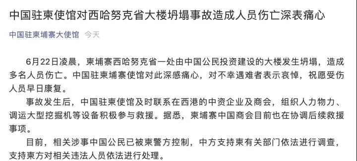 下面是中國駐柬埔寨大使館官方微信公眾號的發文:中國駐柬使館對西哈努克省大樓坍塌事故造成人員傷亡深表痛心。