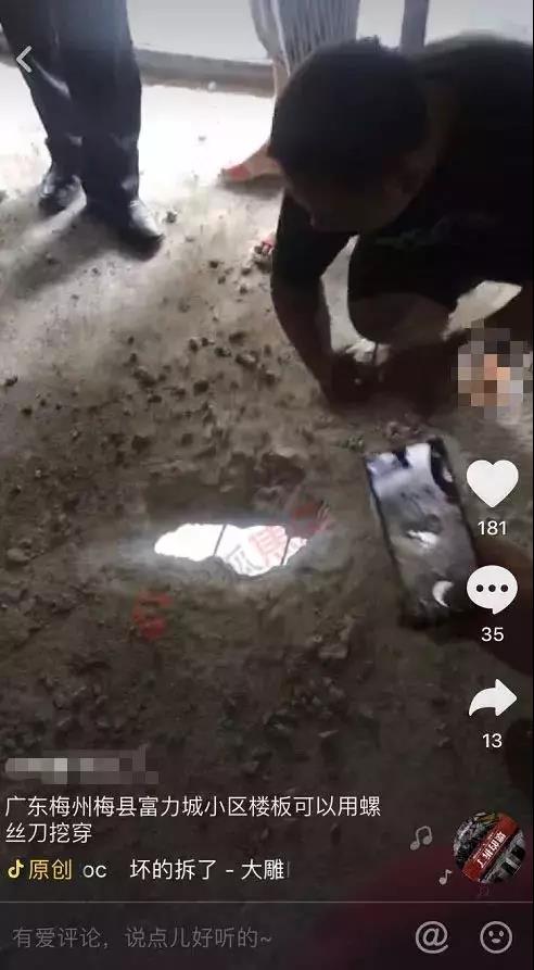 該業(yè)主還提供了一張問(wèn)題房屋業(yè)主L先生(化名)的抖音截圖,小助理在L先生抖音首頁(yè)上發(fā)現(xiàn)了兩段關(guān)于梅州富力城的視頻,其中一段視頻,瀏覽量已達(dá)4.4W,并配文表示梅州富力城小區(qū)樓板可以用螺絲刀挖穿,這樣的工程質(zhì)量不知道相關(guān)部門(mén)是怎么驗(yàn)收合格的。