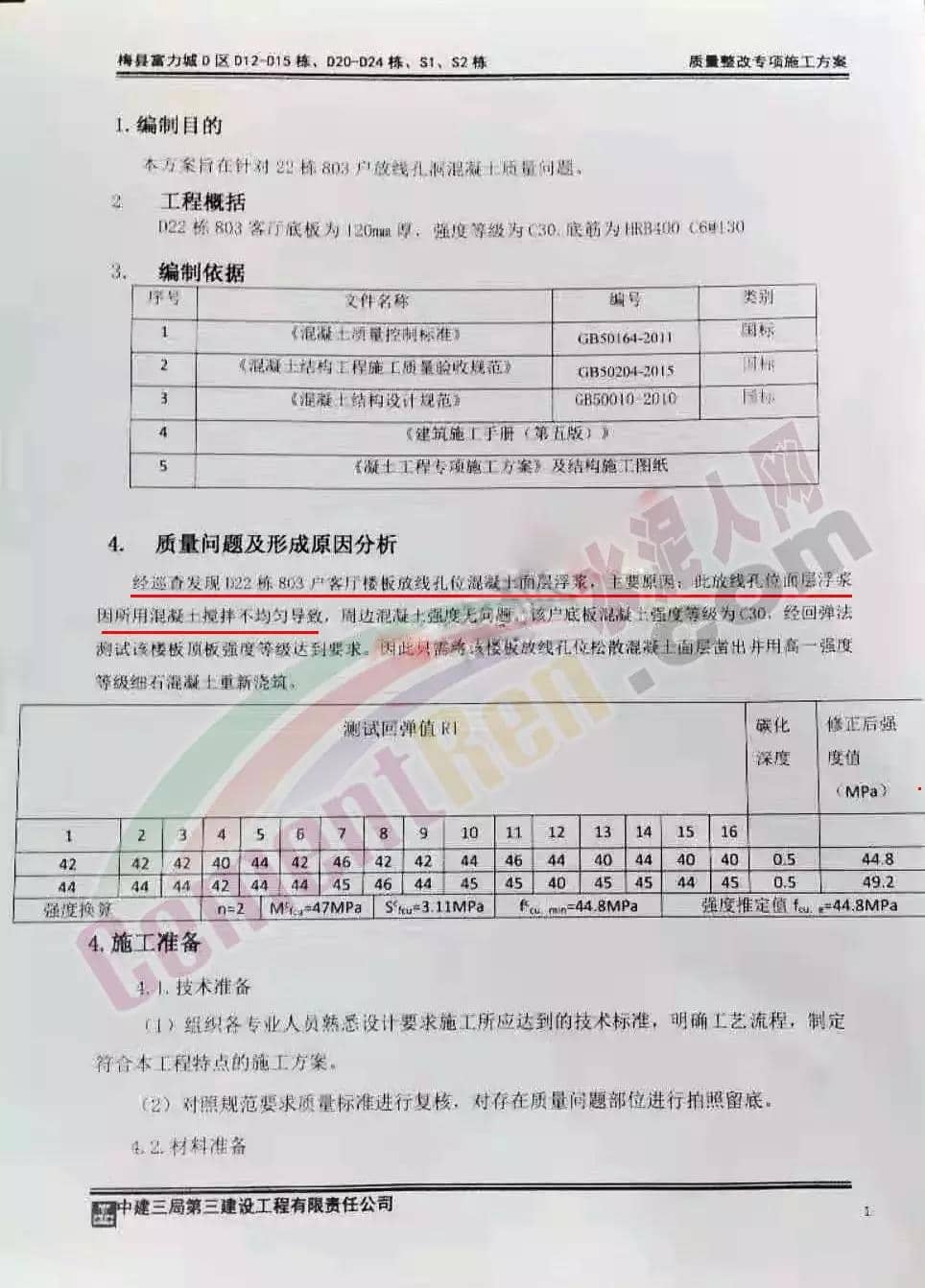 該質(zhì)量整改項(xiàng)施工方案中指出:經(jīng)巡查發(fā)現(xiàn)D22棟803戶客廳樓板放線孔位混凝土面層浮槳因所用混凝土攪拌不均勻?qū)е拢苓吇炷翉?qiáng)度無(wú)問(wèn)題,一句輕描淡寫(xiě)的話就給此事劃上了句號(hào)。