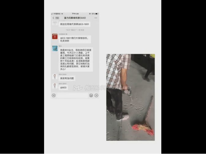 據(jù)梅州富力城4期初業(yè)主表示:昨晚該視頻在微信群傳開(kāi)了,出于對(duì)自身房屋的擔(dān)憂,還特意去檢測(cè)了下自己的房子,幸好沒(méi)發(fā)現(xiàn)問(wèn)題。“可能是不同時(shí)期建造的房子,混凝土質(zhì)量不一樣。” 該業(yè)主表示。