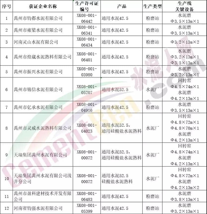 禹州市部分水泥企業(yè)名單
