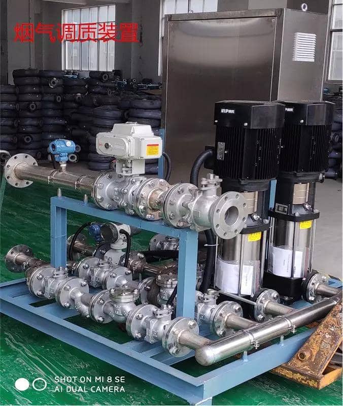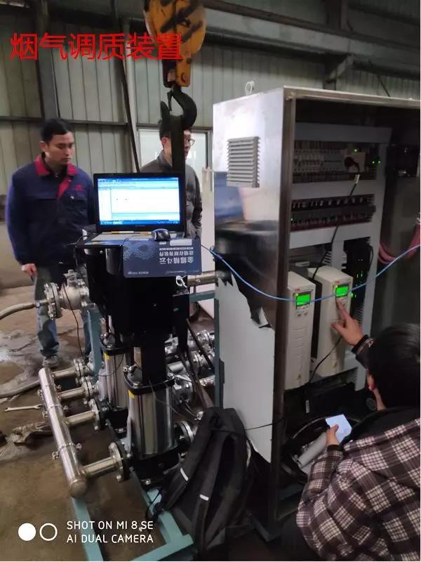 需要特別說明的是,江蘇一品環保提供的煙氣調質技術,絕非傳統意義上從篦冷機上噴水降溫的簡單措施, 許多水泥生產線窯頭采用單流體噴槍,產生的霧滴的粒徑大,(通常在800um以上),熟料容易板結篦床,而且噴霧量無法精準控制,效率低下。江蘇一品的智能煙氣調質系統,(專利技術:ZL 2016 1 0048096.8)主要特點是壓縮空氣參與水流霧化,使得整個系統的水流壓力僅有0.4 Mpa(噴槍處)~0.9 Mpa(水泵出口處),所需壓縮空氣進口壓力0.5Mpa~0.6Mpa。由于壓縮空氣參與了水流霧化,使得噴水量的控制變得相當容易,無論噴水量大小如何,只要保證系統壓縮空氣壓力不低于0.3Mpa,就可以達到相同的霧化效果 平均霧粒100um,最大霧粒180 um,部分霧落在熟料上,大部分的霧在熟料之上的熱煙氣中迅速蒸發,即主要冷卻窯頭煙氣,同時也部分冷卻熟料。另外由于降低了水流的壓力,使得水泵的功率也相應大大的降低了,即使加上壓縮空氣所需的電耗,能耗也比高壓直噴式低10%~20%,噴槍孔徑4.8mm~6.2mm,不容易堵塞,也不容易磨損,使用壽命在5年左右。