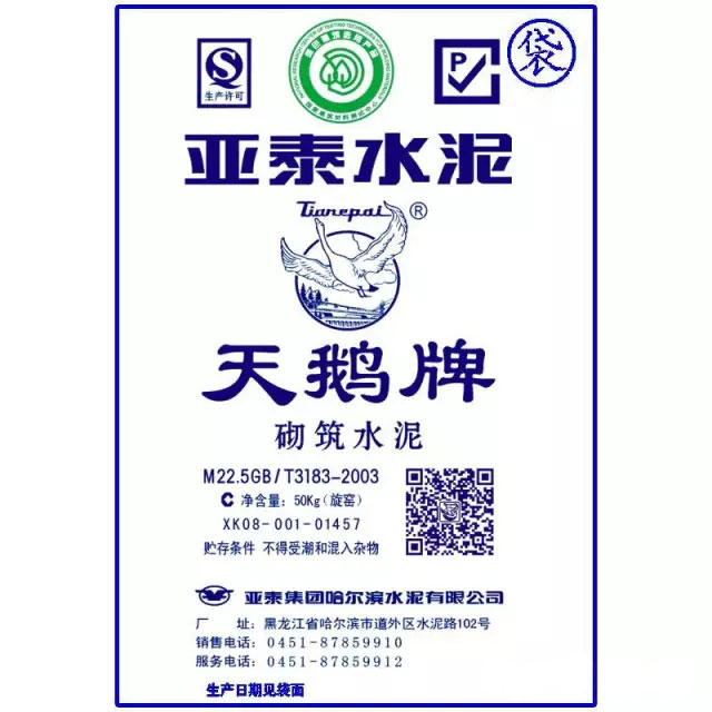 1、“天鵝”牌M22.5水泥包裝袋質量符合GB9774-2010標準,標識齊全,袋面有工廠名稱、廠址、生產許可證編號、水泥名稱(砌筑水泥)、注冊商標、標號(M22.5)、水泥出廠時間、編號(整齊的機器噴碼),請在購買時加以檢驗。