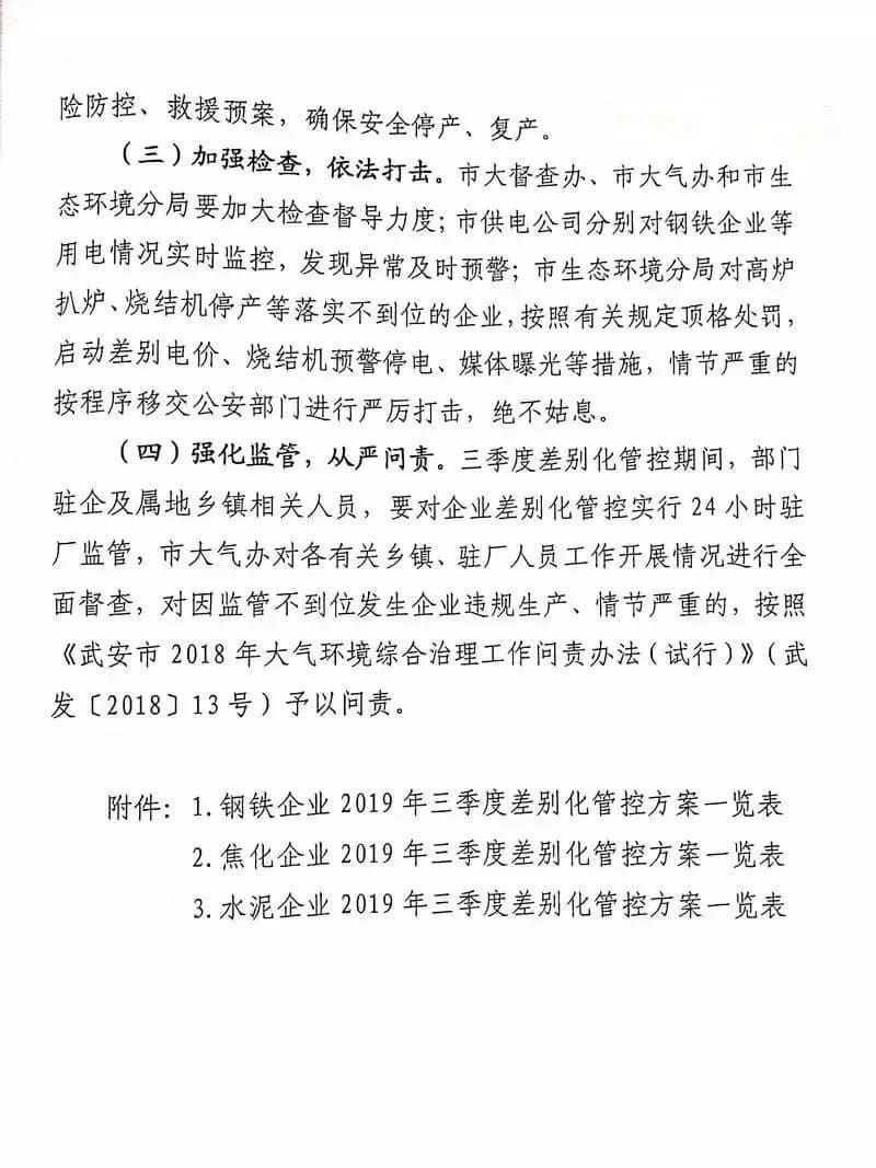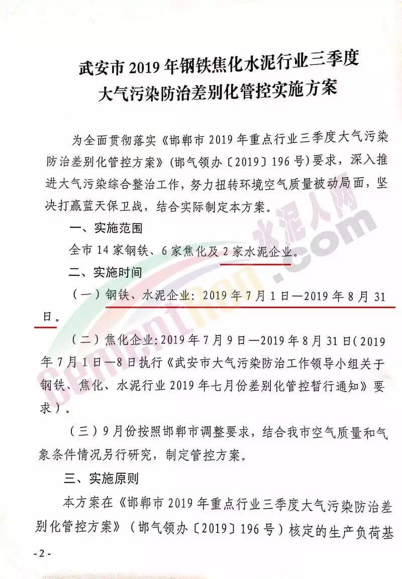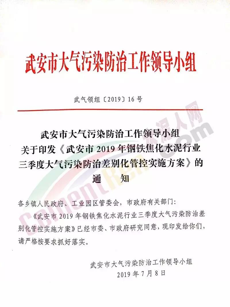 水泥人網消息:7月8日,武安市政府印發《武安市2019年鋼鐵焦化水泥行業三季度大氣污染防治差別化管控實施方案》的通知。要求在7月1日-8月31日期間,全市14家鋼鐵、6家焦化及2家水泥企業按照要求執行錯峰停產政策,9月份結合本市的空氣質量和氣象條件再另行制定管控方案。方案原文如下: