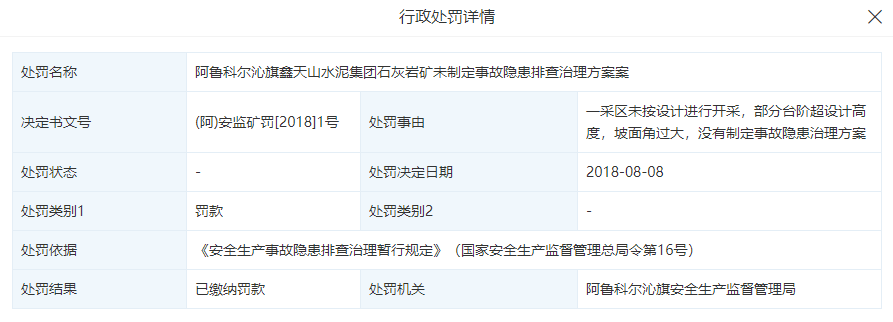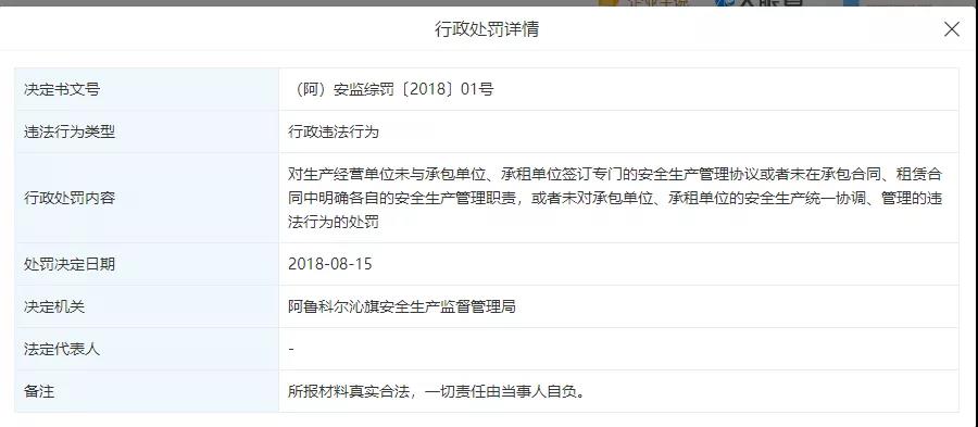 2018年 8月15日,阿魯科爾沁旗安全生產(chǎn)監(jiān)督管理局對企業(yè)行政違法行為實(shí)施行政處罰,處罰內(nèi)容為對生產(chǎn)經(jīng)營單位未與承包單位 、承租單位 簽訂專門的安全生產(chǎn)管理協(xié)議或未在承包合同、租賃合同中明確各自的安全生產(chǎn)管理職責(zé),或者未對承包單位 、承租單位 的安全生產(chǎn)統(tǒng)一協(xié)調(diào)、違法行為的處罰。