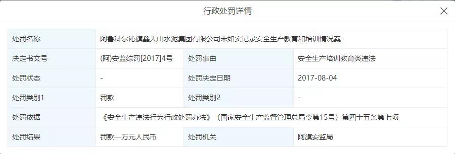 2017年8月4日,阿旗安監(jiān)局曾針對企業(yè)未如實(shí)記錄安全生產(chǎn)教育和培訓(xùn)情況做出行政罰,罰款一萬元人民幣。